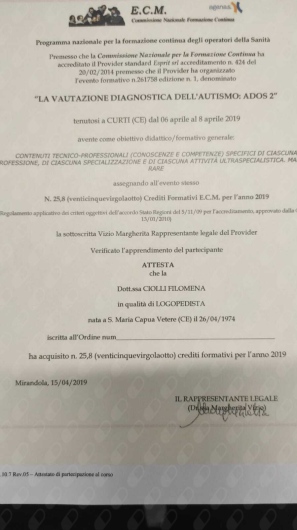 Ho ottenuto attestato tecnico- professionale x la valutazione diagnostica dell'autismo :ADOS