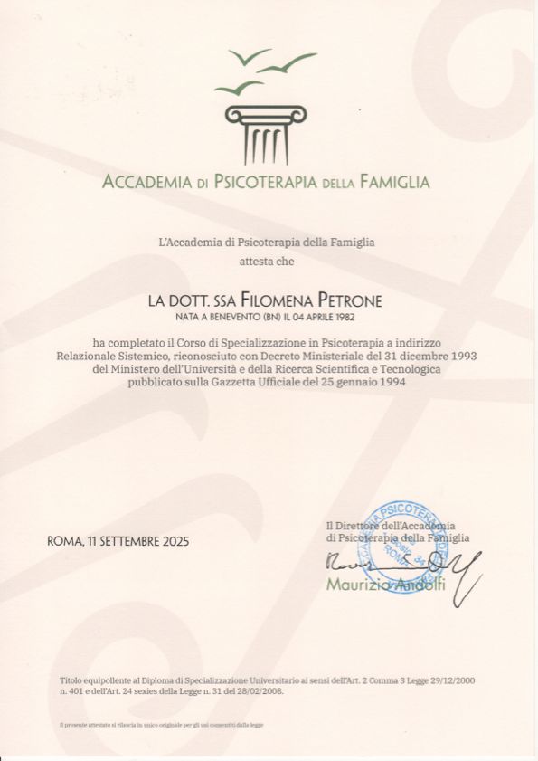 Sono una Psicologa dello sviluppo e dell’educazione e Psicoterapeuta a indirizzo relazionale sistemico, formata presso l’Accademia di Psicoterapia Familiare di Roma diretta da Maurizio Andolfi.