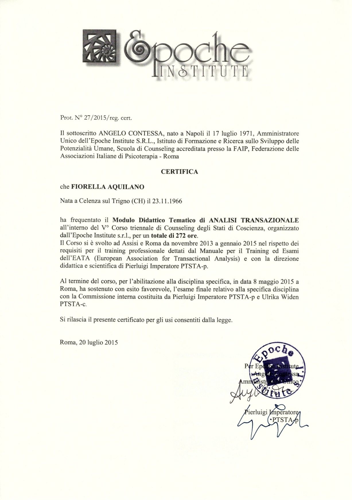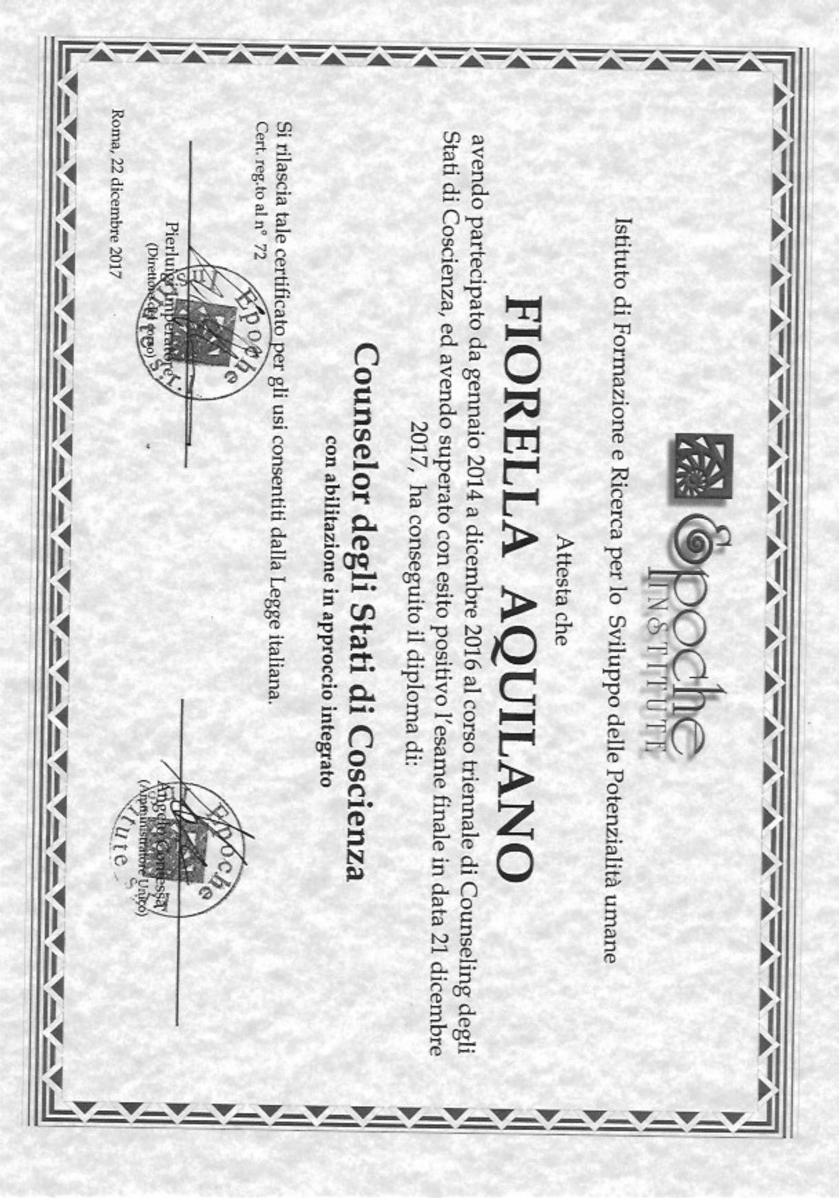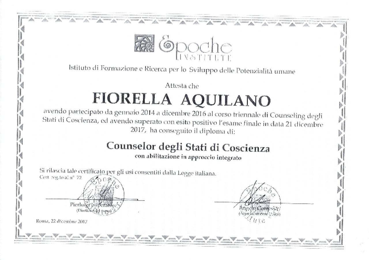 Benvenuta/o Sono la dott.ssa Fiorella Aquilano, Psicologa Clinica, iscritta all'Ordine degli Psicologi della Regione Abruzzo n° 3817 Psicoterapeuta in supervisione, Professional Counselor, Professional Coach. Attualmente esercizio come professionista autonoma, dedicandomi principalmente alla clinica, con un focus sulla prevenzione e il trattamento del disagio psicologico. Ho anche una lunga esperienza come Infermiera Professionale e Insegnante di musica. Perché menziono il mio passato? Perché sono convinta che intraprendere nuove strade, esplorare nuove passioni e diventare un individuo che desidera attivamente il cambiamento, sia fondamentale per la crescita personale e professionale. La psicoterapia infatti, rappresenta un percorso che offre opportunità di trasformazione e rinnovamento.
