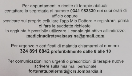 o attraverso la mail medicinadiretevalsassina@gmail.com.