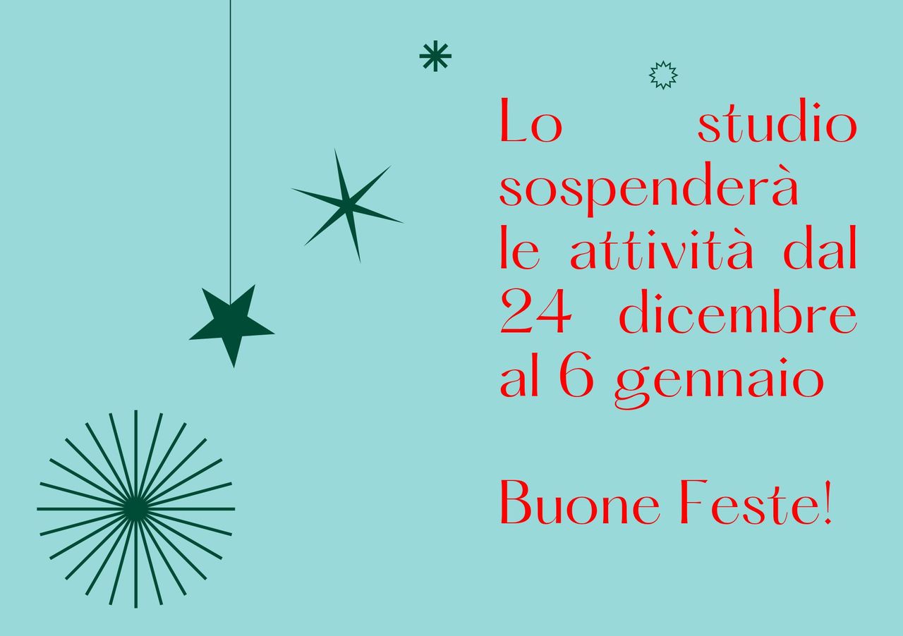 Lo studio sospenderà le attività da mercoledì, 24 dicembre, a martedì, 6 gennaio.