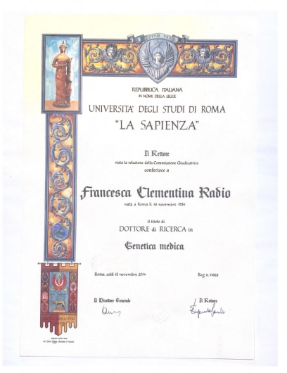 La dr.ssa Radio, medico-chirurgo, specialista in Genetica Medica ha iniziato la sua attività nel campo della Genetica Medica dall'inizio degli anni 2000 con passione e dedizione. La sua attività clinica è stata da sempre diretta all'applicazione delle nuove tecnologie di sequenziamento del DNA alla diagnosi e presa in carico dei pazienti affetti da malattie rare, ultrarare e orfane di diagnosi sia sindromiche che isolate. Inoltre ha sviluppato competenze in genetica della riproduzione, diagnosi prenatale e diagnosi preimpianto con particolare attenzione ai percorsi di fecondazione assistita. Nel campo della diagnosi prenatale ha esperienza nella gestione di gravidanze ad alto rischio con quadri malformativi fetali. Ulteriore campo di interesse è la genetica oncologica con particolare attenzione alle sindromi da predisposizione neoplastica. L'attività clinica si accompagna costantemente all'attività nel campo della ricerca per offrire ai pazienti nuove prospettive diagnostico-terapeutiche in tempo reale con le acquisizioni scientifiche. E' autrice di oltre 80 lavori su riviste scientifiche internazionalmente riconosciute. La sua attività ha permesso di descrivere la sindrome Radio-Tartaglia, una nuova sindrome del neurosviluppo.