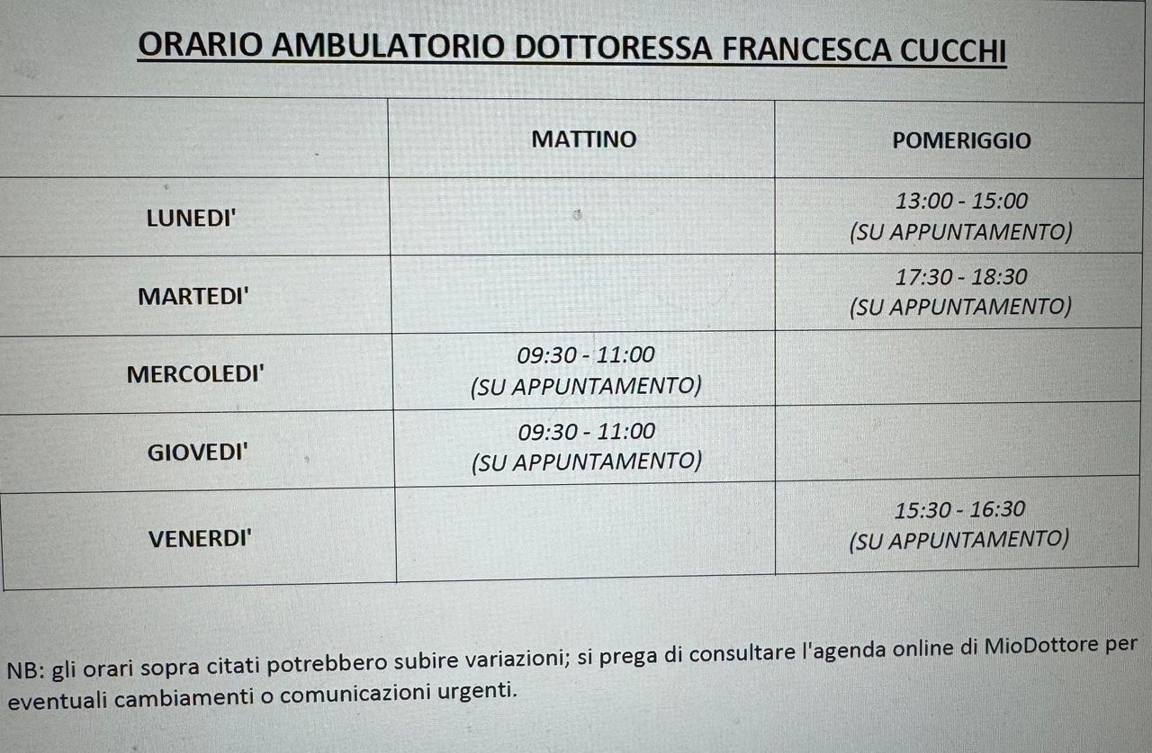 N.B. Gli orari sopra citati potrebbero subire variazioni; si prega di consultare l’agenda on line di MioDottore per eventuali cambiamenti o comunicazioni urgenti.