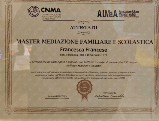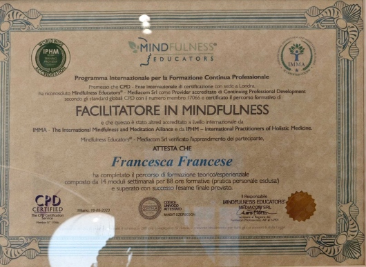 Psicologa iscritta all'albo A della Regione Emilia Romagna. Laurea Magistrale in Psicologia e in Giurisprudenza entrambe con Lode. Master in Diritto internazionale, Mediazione Familiare e scolastica, diplomi e certificati riconosciuti in Buddhist Psycology and Philosophy , Logica e dibattito oltre che tecniche Mindfulness secondo accreditamento Internazionale. Porto la mia esperienza e pratica nell'incontro con il paziente, facendo uso, ove adeguato, di tecniche mediate dalla meditazione buddhista e taoista oltre che dalla psicologia moderna affinchè ognuno possa risvegliare il proprio potenziale nella ricerca della sua più autentica realizzazione. Mi occupo da anni di formazione e consulenza nel settore sanitario sui temi della prevenzione e cura del burnout per la promozione della salute mentale e fisica a tutela del benessere psicologico. Ho esperienza nel settore dell'emergenza e sui temi del trauma e del lutto. Il mio percorso parte sin da giovane nelle discipline orientali e nell'investigazione e studio della mente. Ho rivolto il mio impegno alla ricerca dell'equilibrio corpo/ mente attraverso una costante pratica e studio sia secondo le tecniche della tradizione orientale (yoga, arti marziali classiche e pratiche meditative ) sia con l'esperienza occidentale più contemporanea. Mi sono occupata per anni di temi in ambito sociale e svolto attività di volontariato in Italia e all'estero grazie anche alla specializzazione in diritto internazionale ed umanitario. Rivolgo la mia attività anche all'ambito della mediazione familiare, date le mie competenze e titoli sia giuridico che psicologico, nell'attenzione primaria alla tutela e all'interesse dei minori in contesti conflittuali o potenzialmente tali.