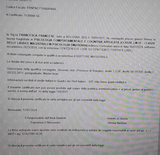 Grazie alla straordinaria perseveranza, pazienza e competenza della Dott.ssa Francese, ho intrapreso un percorso di crescita e consapevolezza che sta trasformando profondamente la mia vita. Ogni passo che ho fatto con lei ha portato benefici non solo a me, ma anche alle persone che mi stanno accanto. Se si desidera un lavoro autentico e profondo su te stesso, capace di portare reali cambiamenti esistenziali, non posso fare a meno di raccomandarla caldamente.