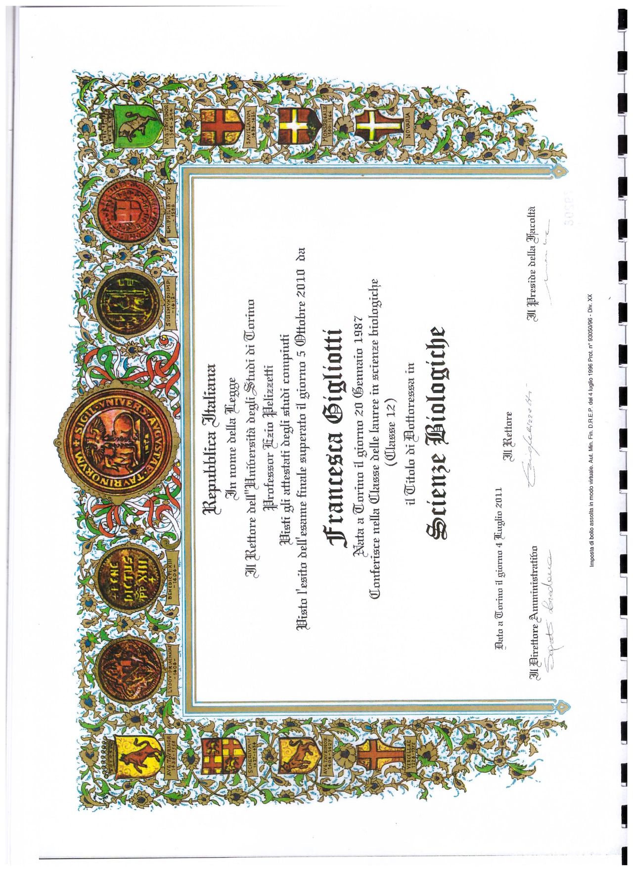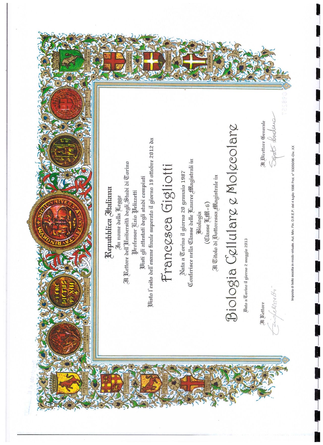Sono la Dott.ssa Francesca Gigliotti, laureata in Scienze Biologiche con il massimo dei voti presso l'Università degli studi di Torino.
