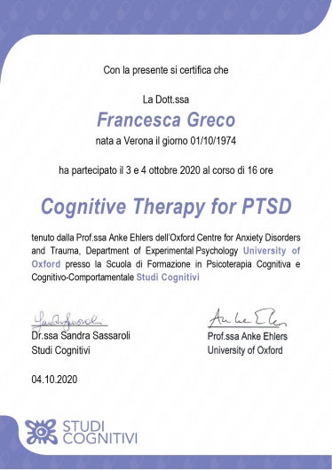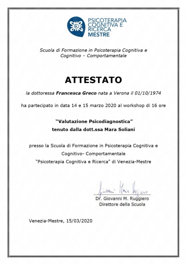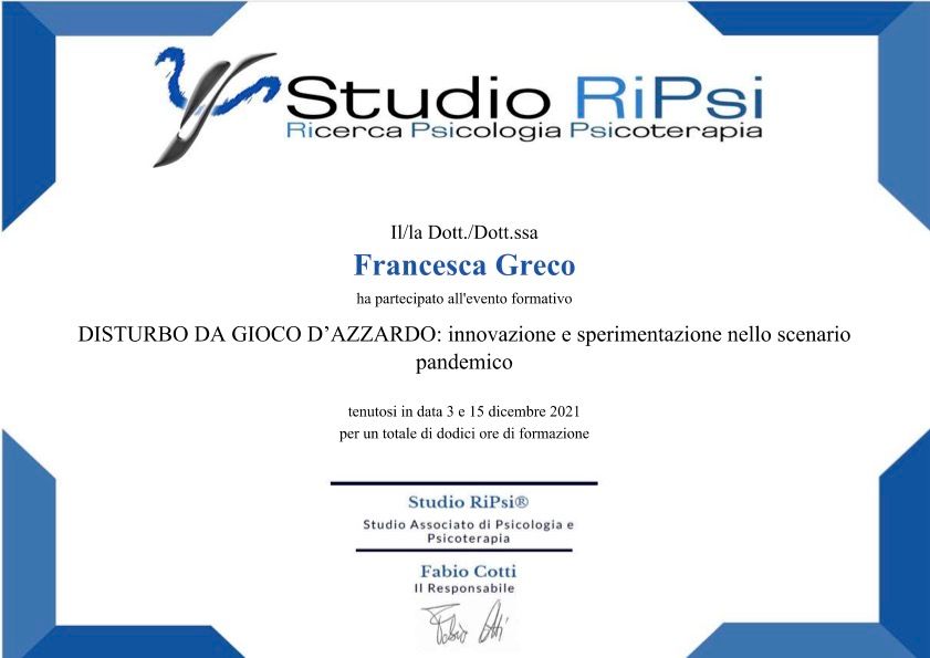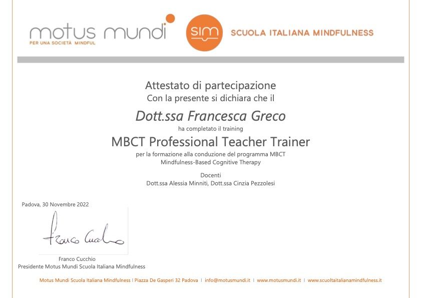 Sono Francesca Greco psicologa-psicoterapeuta ad orientamento cognitivo comportamentale e consulente sessuologica. Per quasi 20 anni ho lavorato in aziende dove mi occupavo di selezione del personale oppure di aspetti commerciali. Guardandomi intorno ho notato quanto il disagio potesse insorgere a causa del proprio ambiente lavorativo e dell'incapacità di far fronte a determinate sollecitazioni, come ad esempio la qualità delle relazioni. Così, dopo la mia prima laurea in scienze dell'educazione (presa nel 2000) ho deciso di rimettermi in gioco e di laurearmi in Formazione e sviluppo delle risorse umane (Psicologia del lavoro). Ritengo fondamentale coltivare il benessere personale e collettivo a 360° soprattutto imparando a gestire ambienti e situazioni in cui passiamo la maggior parte della nostra vita. Nel frattempo, ho continuato a formarmi e mi sono iscritta alla specializzazione in psicoterapia di orientamento cognitivo comportamentale, dando anche una base più solida agli interventi che effettuo in ambito di psicologia del lavoro, che spesso sfociano nella psicologia clinica, come ad esempio depressione dovuta al burnout, ansia, ansia da prestazione, fronteggiamento dei conflitti, stress lavoro correlato, psicodiagnostica, rilevamento dello stato di mobbing.