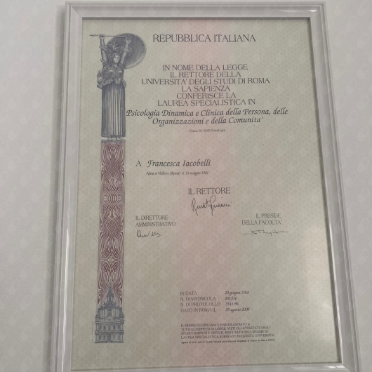 Ho iniziato il mio percorso con la Dottoressa Iacobelli con qualche timore, ma sin dal primo incontro mi sono sentita completamente a mio agio. È una professionista gentile, paziente ed estremamente empatica, capace di ascoltare senza giudicare e di guidarmi nei ragionamenti con grande sensibilità. La sua disponibilità e il suo modo di porsi mi hanno aiutata a esprimermi liberamente, rendendo ogni seduta un momento di crescita e consapevolezza. La consiglio a chiunque cerchi un supporto professionale in un ambiente sereno e accogliente.