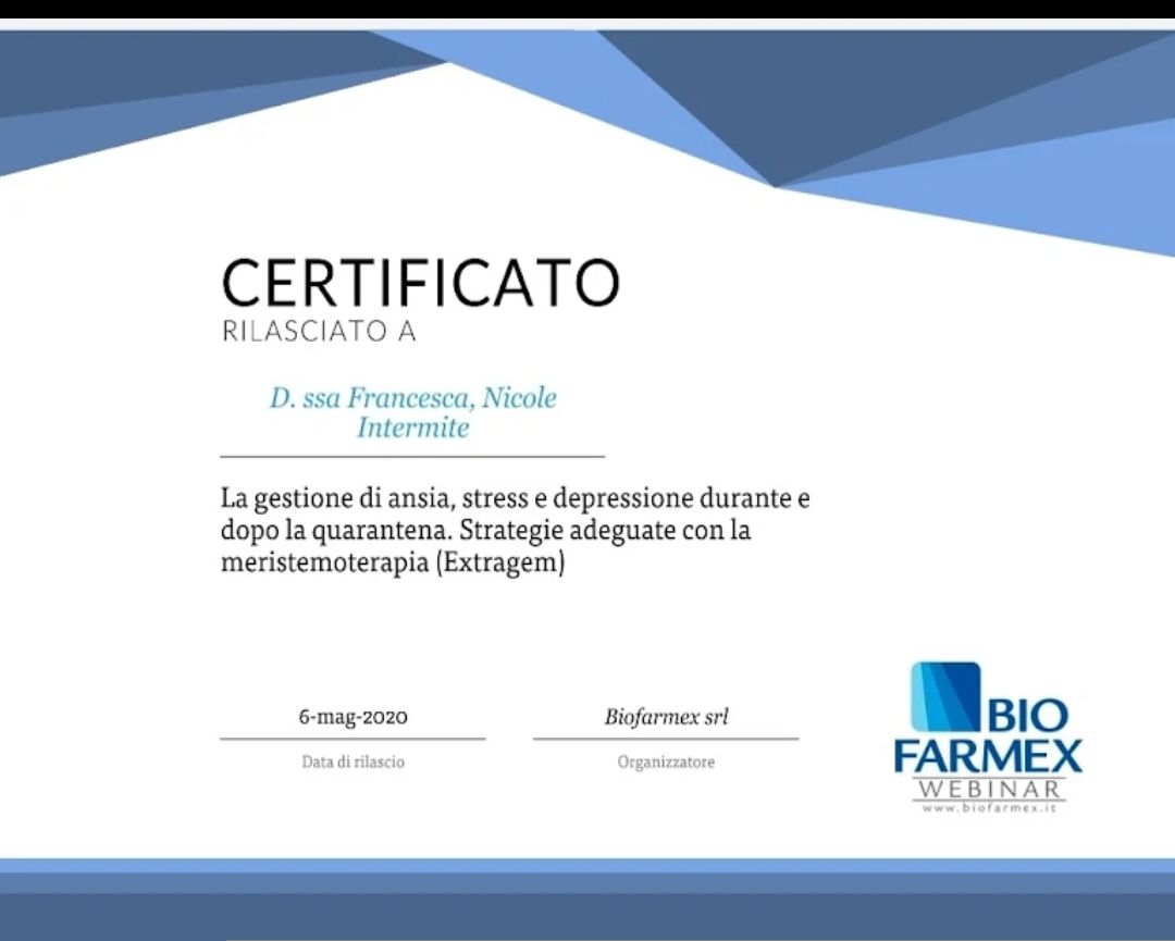 Sono stata dalla Dottoressa Intermite qualche settimana fa.Mi ha fatto un trattamento per sbloccare la zona delle spalle e della cervicale . Il risultato è stato eccezionale a distanza di qualche giorno sono stata benissimo. Lei è estremamente dettagliata nello spiegarti le problematiche, ti mette a tuo agio ed è molto gentile e disponibile.