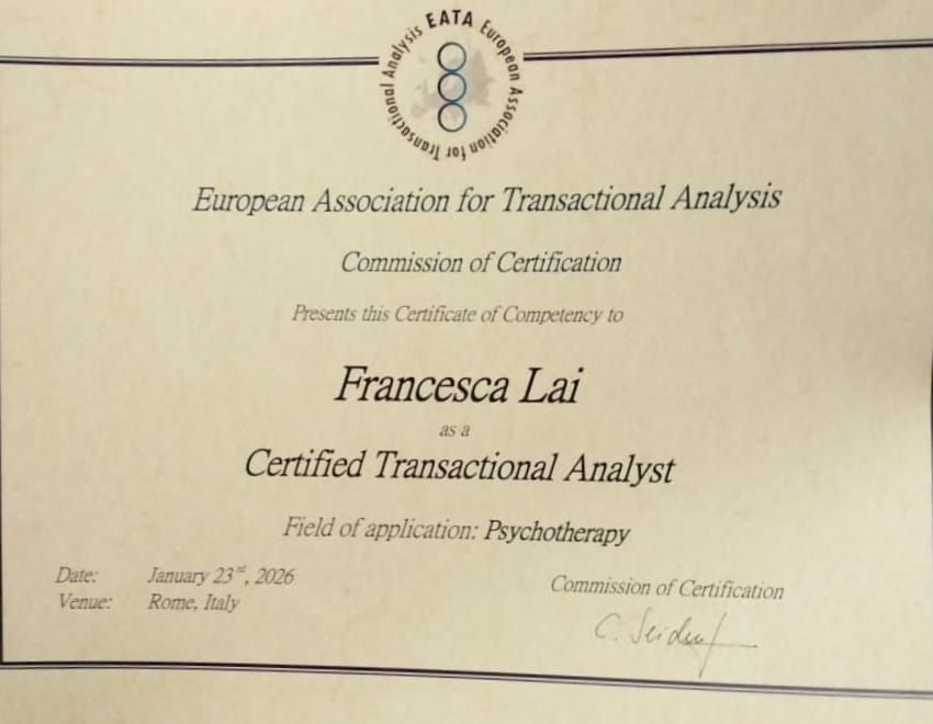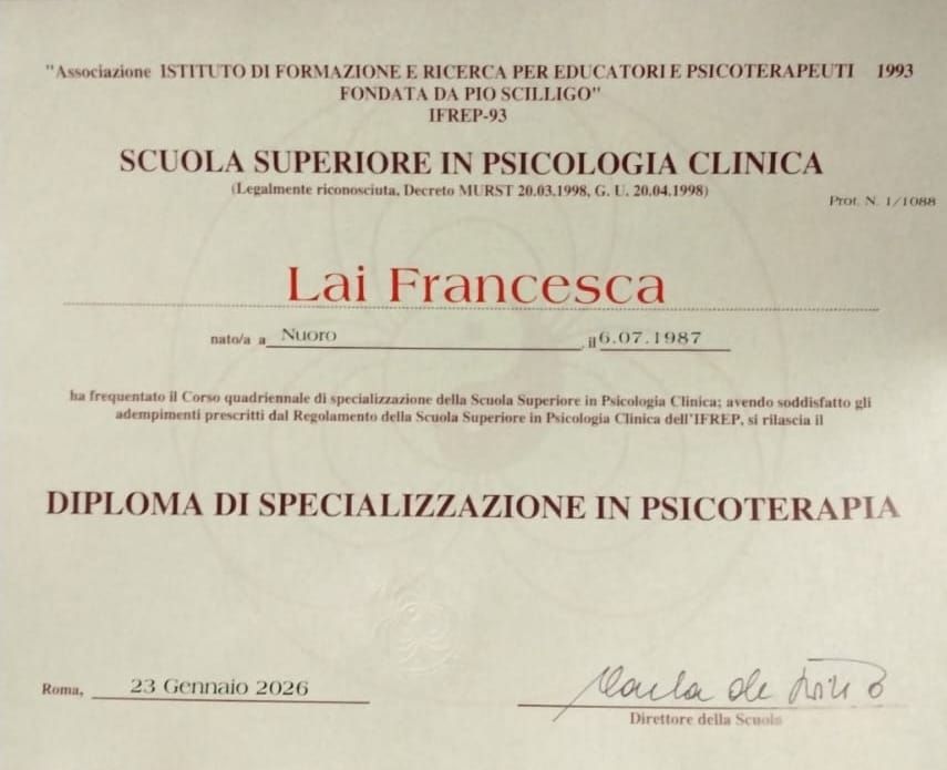 Sono la dott.ssa Francesca Lai, medico-chirurgo e psicoterapeuta. Sono iscritta all’Ordine dei Medici Chirurghi e degli Odontoiatri della Provincia di Cagliari dal 2018. Mi sono laureata in Medicina e Chirurgia presso l’Università degli Studi di Cagliari con votazione 110/110 e successivamente mi sono specializzata in psicoterapia presso la scuola SSPC-IFREP.