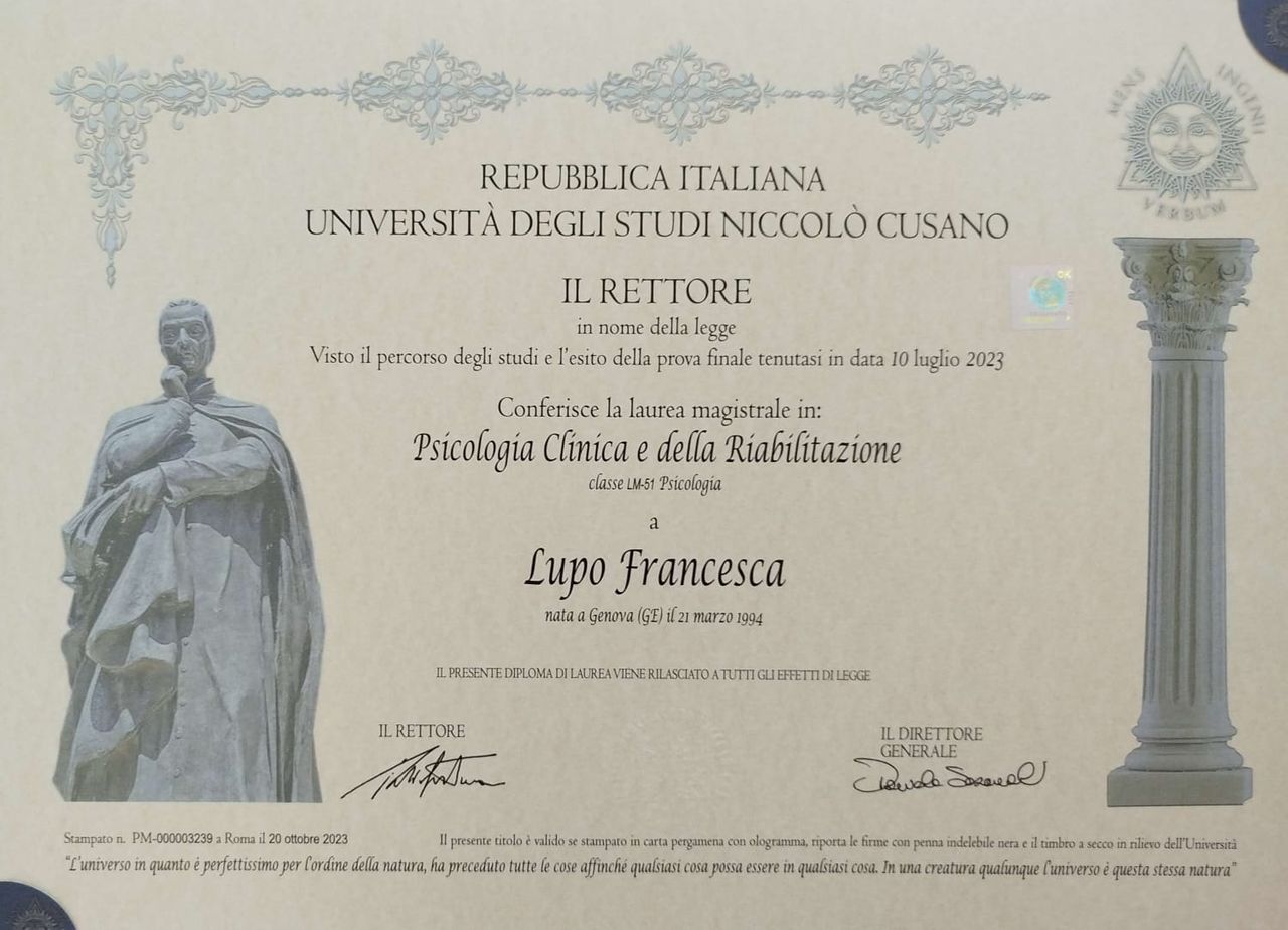 Buongiorno, devo dire che la dott. Lupo mi ha fatto superare tutti i miei pregiudizi...giovane, gentile, disponibile, mi ha fatto sentire subito a mio agio...sono soddisfatta e continuerò il mio percorso...!