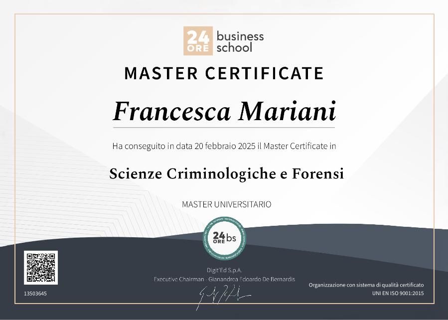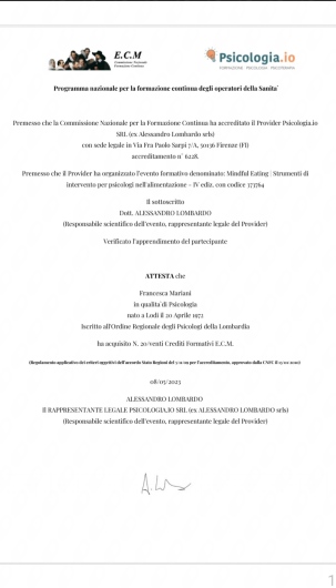 Laurea in Giurisprudenza, con tesi in Diritto Processuale Penale dal titolo "La tutela della salute del malato detenuto", Unipr; Laurea Triennale in Scienze del Comportamento e delle relazioni interpersonali e sociali (appartenente alla classe n.34 delle lauree in Scienze e Tecniche Psicologiche), Unipr, con una tesi dal titolo "Le emozioni nell'apprendimento". Tirocinio Laurea Triennale presso "Agropolis", Soc.Coop. a R.L., Cavatigozzi, Cremona; Laurea Magistrale in Psicobiologia e Neuroscienze Cognitive, Unipr, con una tesi dal titolo " I fratelli in analisi". Tirocinio L.M. presso Fondazione I.R.C.C.S. Istituto Neurologico " Carlo Besta", Milano, (U.O. Neuroradiologia); Tirocinio post-lauream presso Fondazione I.R.C.C.S. Istituto Neurologico "Carlo Besta" , Milano (1° semestre Neuroradiologia; 2° semestre Neuroanestesia e Rianimanzione). Durante questo periodo formativo ho assistito come tirocinante all'iter Diagnostico (Neuroimaging) e Clinico di valutazione del Paziente Prechirurgico ed ad interventi di "awake surgery", nel corso dei quali ho appreso sul campo il Ruolo Professionale svolto dallo Psicologo Clinico e dal Neuropsicologo in sala operatoria, sia nella gestione degli stati di ansia a cui il Paziente può andare incontro mentre è sveglio e deve collaborare con il Neurochirurgo, sia nella somministrazione dei test neuropsicologici al Paziente, grazie ai quali il Neurochirurgo riceve in tempo reale un feedback dell'intervento neurochirurgico. Nutro particolare interesse per la Psicologia dello sviluppo e perinatale; la Neuropsicologia; la Psicologia dello sport; la Psicologia Alimentare e la Mindfulness, materie che ho approfondito nel corso della mia formazione e che mi hanno portato a scegliere come Laurea Magistrale il corso di Psicobiologia e Neuroscienze Cognitive o alle quali mi sono avvicinata successivamente. Sono Psicologa dello Sport, iscritta alla Fipsis ed all’ Albo degli Psicologi dello Sport, con Master in Psicologia dello Sport. Master di 2 livello presso UNITELMA Sapienza con tesi su “ AI, alimentazione ed obesità ". Master di 2 livello presso 24ORE BS in Scienze Criminologiche e Forensi con tesi "Il ruolo dello Psicologo nell'esame del minore vittima di reato". Sono fermamente convinta che, soprattutto in un mondo dinamico e pieno di stressor, nel quale ci vengono proposti continui modelli ai quali assomigliare, creandoci forte stress ed ansia prestazionale, l'integrazione mente-corpo sia un concetto fondamentale e primario in ogni ambito del nostro funzionamento (sociale, lavorativo, affettivo, sportivo, nutrizionale) e su di esso si debba focalizzare l'attenzione dello Psicologo per prevenire o supportare i disagi psicologici. Per questo motivo ho integrato la mia formazione dedicandomi allo studio approfondito e seguendo corsi e master inerenti nuove materie (Alimentazione, Sport e Mindfullness), che toccano un ambito più relazionale. Mi sono sottoposta per 10 anni e mezzo, 2 volte alla settimana, a Psicoterapia individuale ad orientamento Psicoanalitico ed ho sentito la fatica di guardarmi dentro, in Alleanza Terapeutica con un Professionista molto preparato, che mi ha insegnato a prendere in mano il mio dolore, anche quando avevo paura che fosse troppo grande ed intenso; a dargli un senso; a "farci pace" ed a capire perché in certe situazioni mi comportassi in un certo modo. Questo mi ha permesso di comprendere e accettare i miei vissuti ed anche che facessero parte di me, rendendomi la Persona che sono, risolvendo, in questo modo, i miei conflitti più dolorosi. In quei momenti ho compreso quanto fosse importante la Professione che, oggi, ho