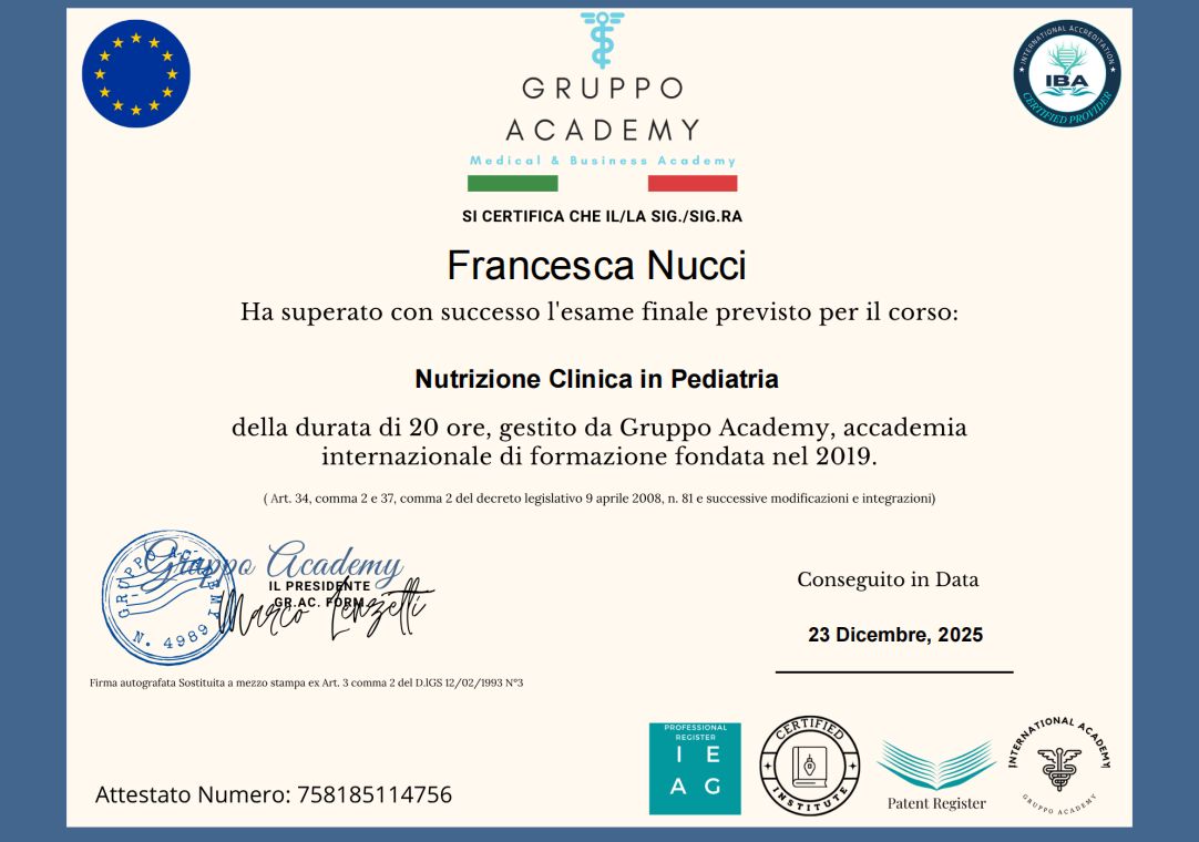 Sono una Biologa Nutrizionista laureata con il massimo dei voti in Scienze della Nutrizione Umana presso l’Università di Pisa nel 2024 e successivamente abilitata. La mia passione per la nutrizione mi ha portata ad approfondire ulteriormente le mie conoscenze attraverso corsi di formazione e aggiornamento su tematiche quali la menopausa, la sindrome dell’intestino irritabile, la nutrizione nello sportivo e la ricomposizione corporea. In particolare, da ottobre 2025 ho iniziato la specializzazione in nutrizione sportiva presso la scuola di nutrizione ed integrazione sportiva - sanis academy.