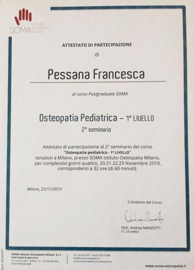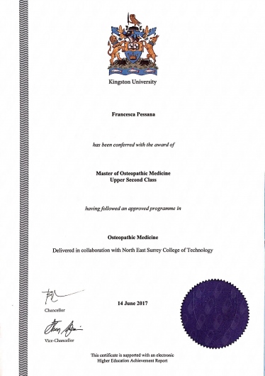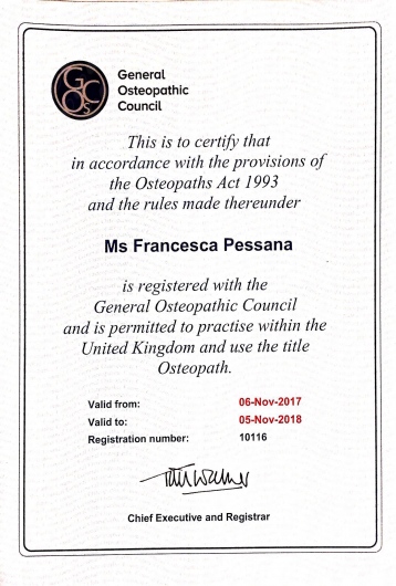Continuo inoltre ad aggiornarmi e a portare avanti attività di ricerca in ambito osteopatico per il General Osteopathic Council (GOsC), l’albo professionale inglese di cui faccio parte dal 2017 con il numero di iscrizione 10116.