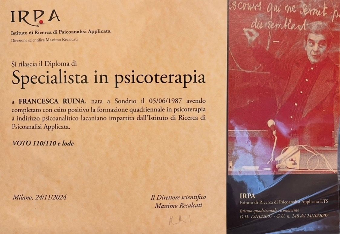 Sono una psicologa e psicoterapeuta a orientamento psicoanalitico lacaniano. Dopo una laurea specialistica in Filosofia, mi sono laureata in Psicologia Clinica e ho poi completato il mio percorso formativo come psicoterapeuta presso l'Istituto di Ricerca di Psicoanalisi Applicata (IRPA), fondata da Massimo Recalcati, con una valutazione di 110 e lode.