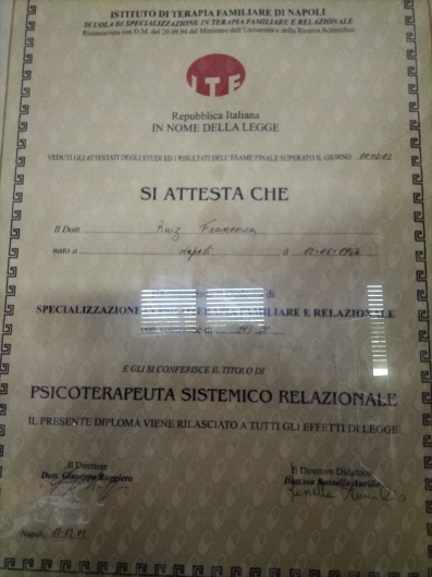 Dopo un percorso di pre- specializzazione, durato tre anni, presso l'Accademia di terapia familiare di Roma, ho iniziato il percorso di specializzazione in terapia sistemico- relazionale nella stessa scuola. Concluso dopo 4 anni presso la scuola di terapia sistemico - relazionale di Napoli, con votazione 90/90