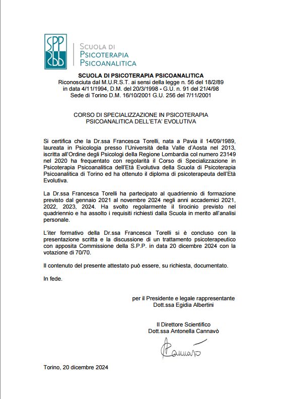 Buongiorno e benvenuto/a, sono la Dott.ssa Francesca Torelli, psicologa e psicoterapeuta.