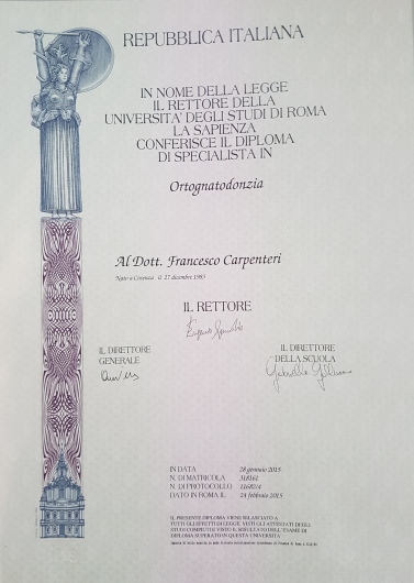 Sono, inoltre, Specializzato in Ortognatodonzia presso l’ Università degli studi di Roma “Sapienza”; ed ho frequentato la U.O.C. (Unità Operativa Complessa) della Clinica Odontostomatologica del Policlinico “Umberto I” di Roma, dal Settembre 2007. Ho frequentato un Corso teorico-pratico di perfezionamento post-universitario su Chirurgia Orale ed Implantologia pressol’A.C.O. (Azienda Complesso Ospedaliero) San Filippo Neri di Roma.