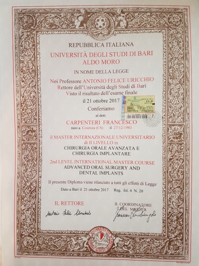Nell'anno 2017 ho conseguito il Master in Chirurgia orale avanzata e Chirurgia Implantare presso l’Università degli studi di Bari “Aldo Moro”.