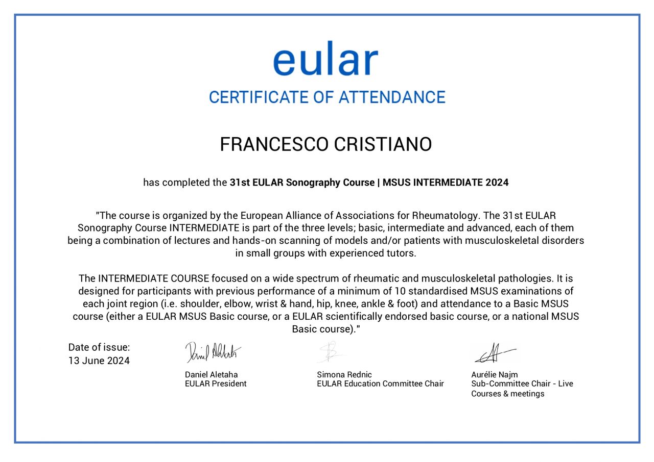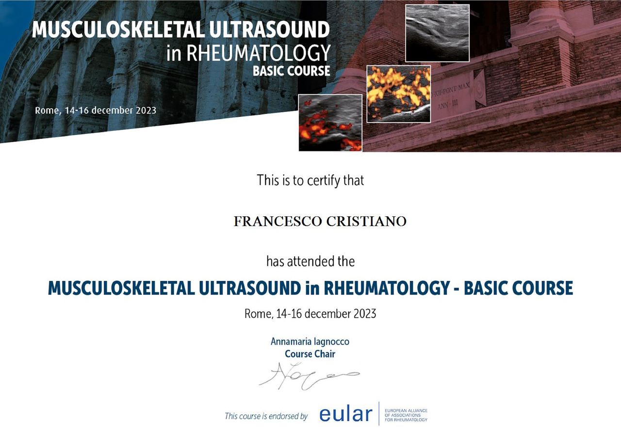 Mi sono rivolto/a al dottor Francesco Cristiano per un problema reumatologico che mi creava disagio da tempo, e non avrei potuto fare scelta migliore. Il dottore si è dimostrato estremamente competente, attento e scrupoloso sin dalla prima visita. Ha ascoltato con grande pazienza tutte le mie preoccupazioni, spiegandomi in modo chiaro ogni passaggio degli esami e del percorso terapeutico.