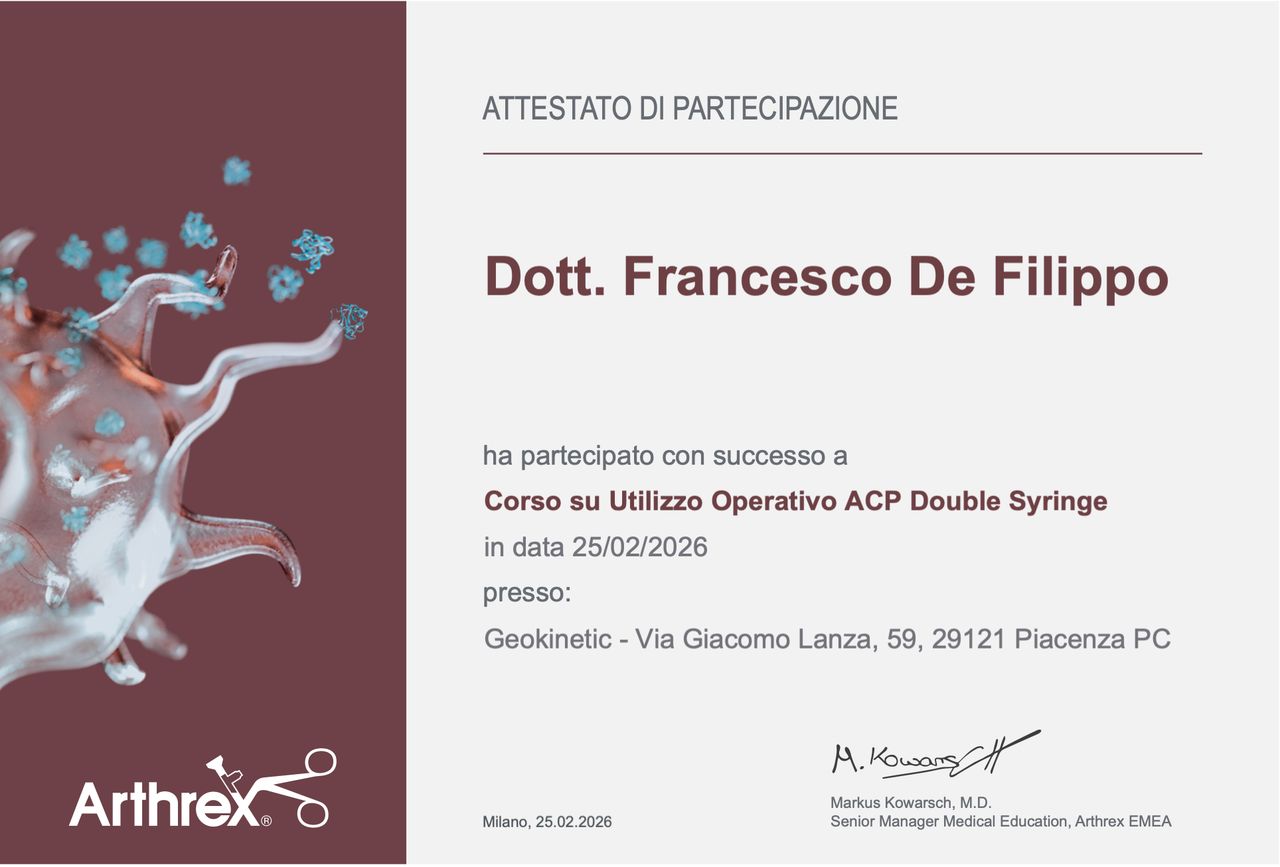 Nel mio approccio clinico, oltre al trattamento chirurgico quando indicato, utilizzo anche terapie conservative avanzate, tra cui infiltrazioni articolari, anche ecoguidate, con acido ialuronico e PRP (plasma ricco di piastrine), con l’obiettivo di ridurre il dolore e migliorare la funzionalità articolare.