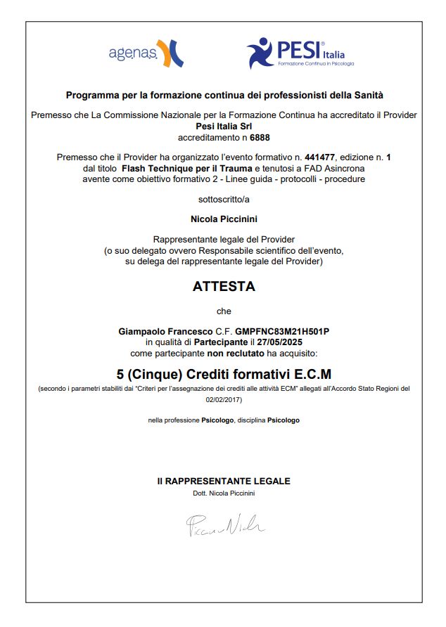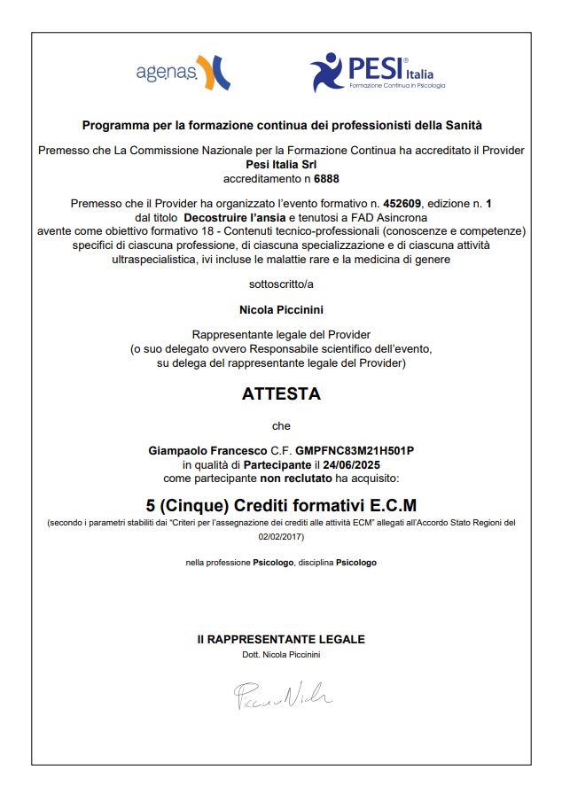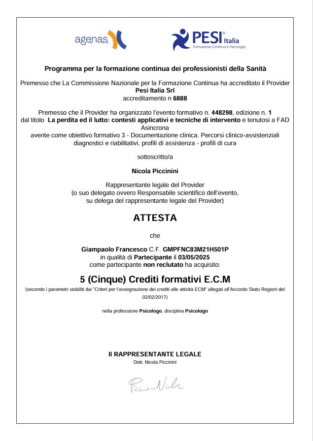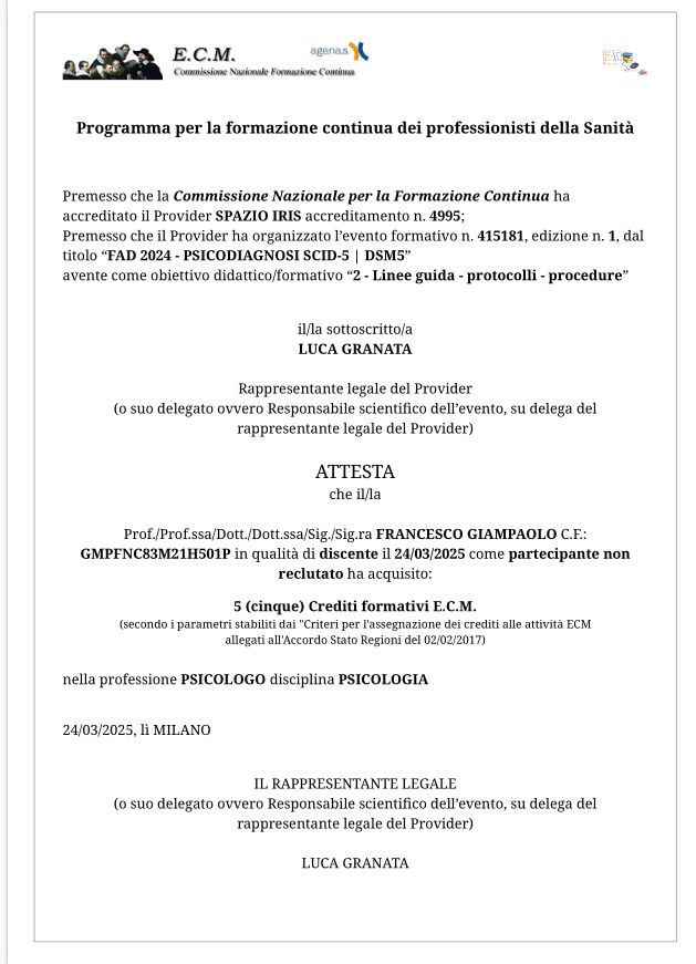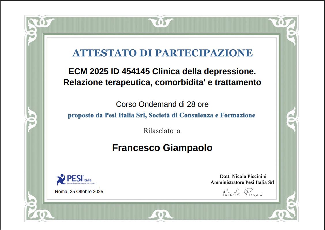 Ho avuto il piacere di conoscere il Dott. Francesco Giampaolo e posso dire con certezza che è un professionista empatico, preparato e profondamente attento al benessere delle persone. La sua capacità di creare un ambiente accogliente rende ogni incontro un momento prezioso di ascolto e crescita personale.