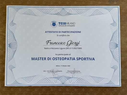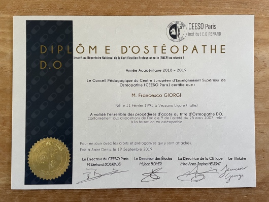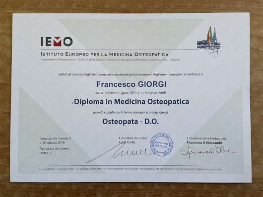 Nel 2019 ho concluso il percorso di studi quinquennale presso l’Istituto Europeo per la Medicina Osteopatica (IEMO) di Genova, ottenendo il titolo di OSTEOPATA D.O. riconosciuto a livello europeo, sia con certificazione italiana che francese, questo grazie al rapporto di partenariato tra la I.E.M.O. di Genova e il Centre Européen d’Enseignement Superieur d’Ostéopathie (CEESO) di Parigi, istituto presso il quale ho svolto due periodi di mobilità nell’arco del 4° e 5° anno di studi.