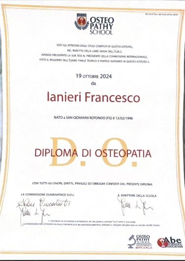 Mi sono presentata dal Dottor Francesco Ianieri per un problema di tipo nevralgico che interessava tutto il lato destro del corpo e in particolare spalla, anca e ginocchio destri. Grazie alla sua professionalità è stato in grado di capire l’origine del problema e di trattare meticolosamente tutte le componenti che contribuivano a creare il dolore. Francesco è molto attento ai dettagli, ha una buonissima manualità ed è molto incline all’ascolto della persona da tutti punti di vista. Consigliatissimo!