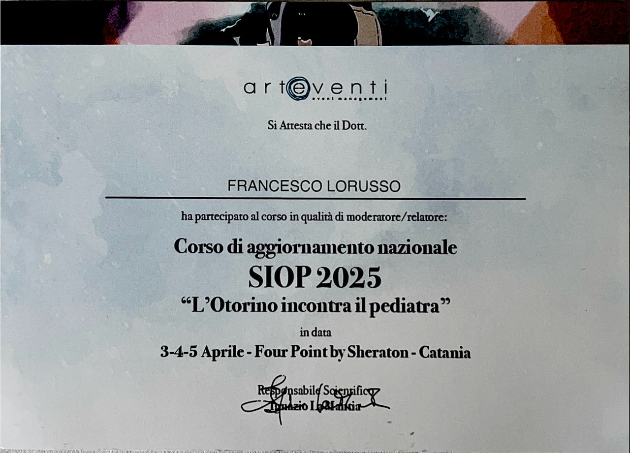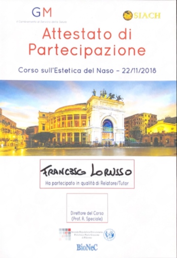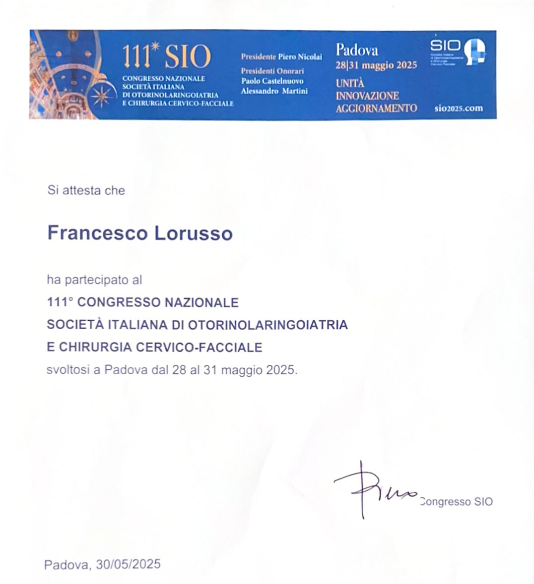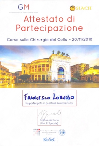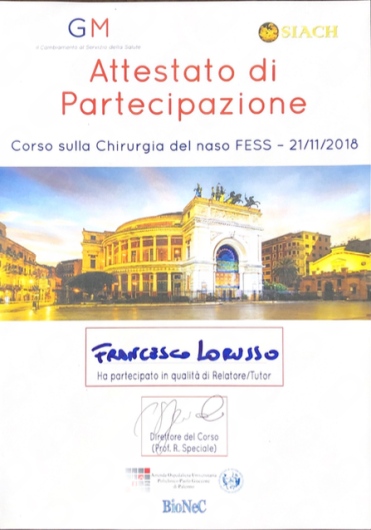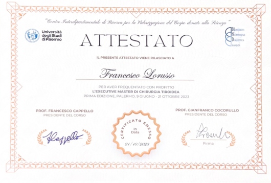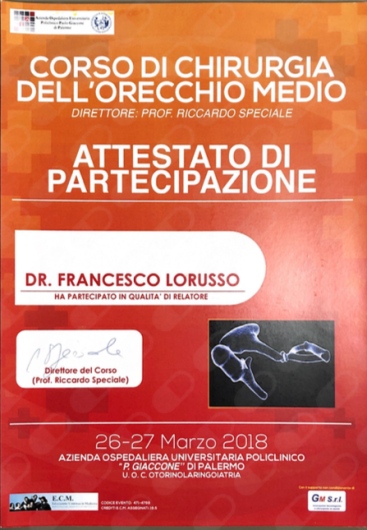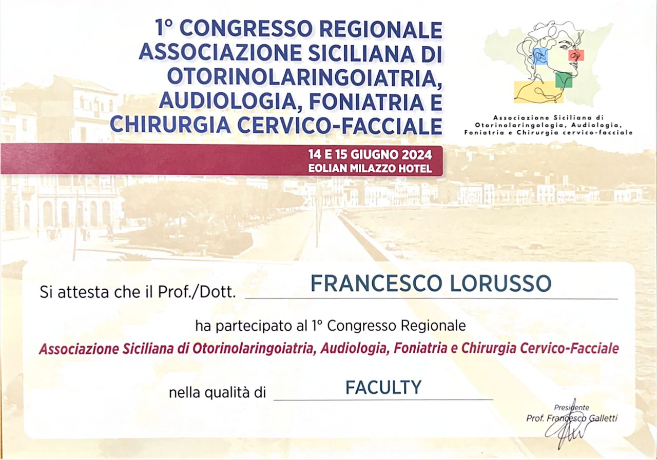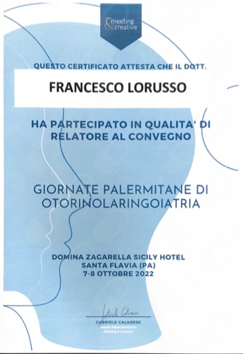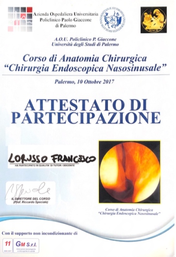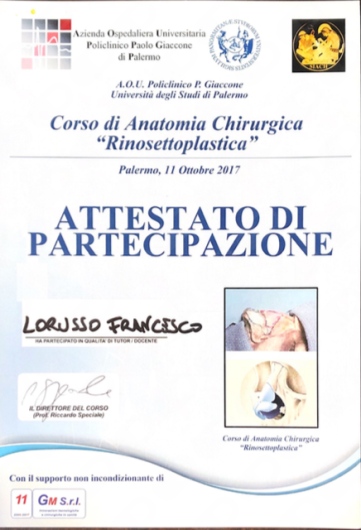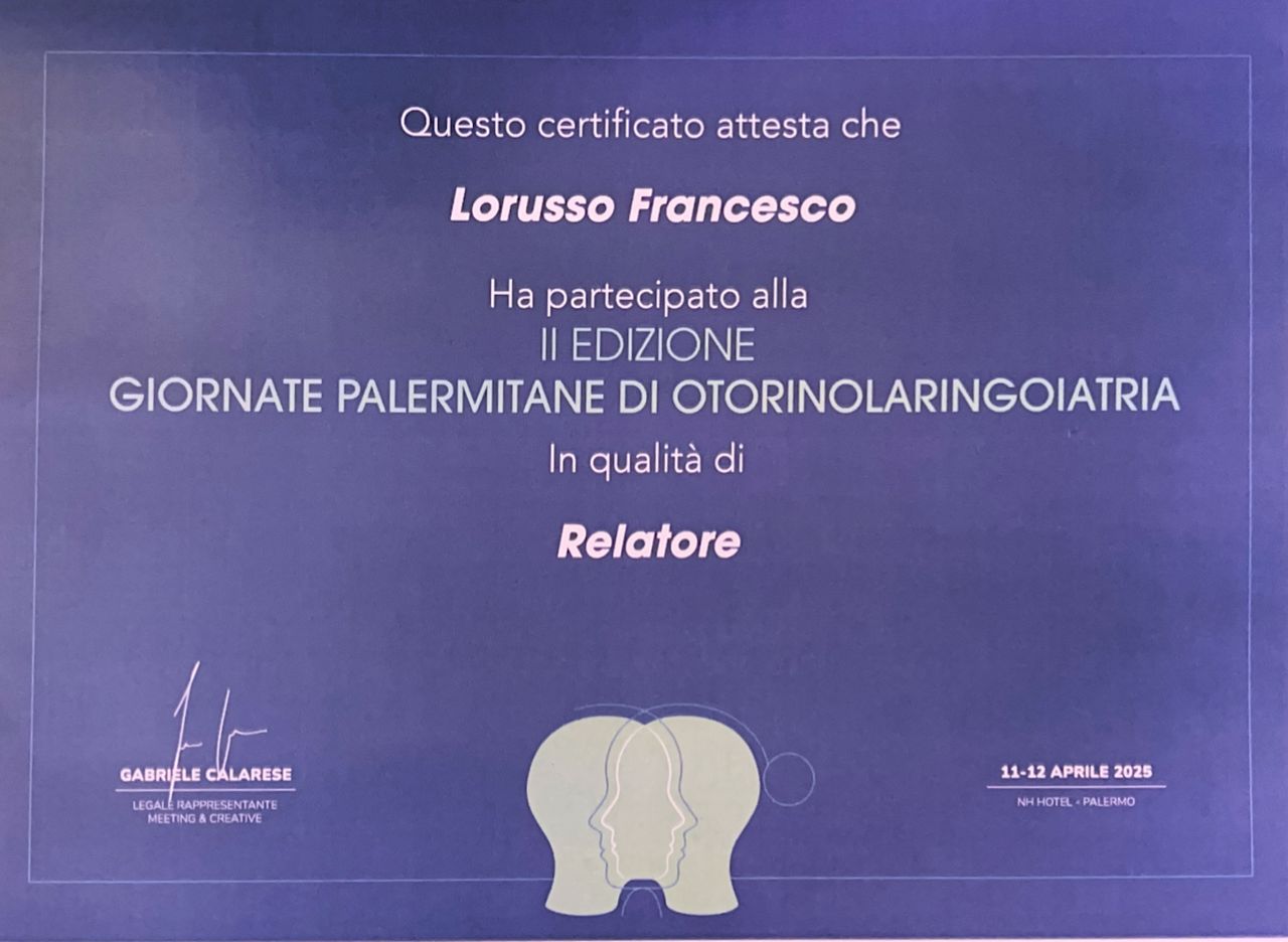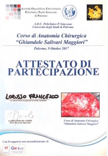 Nel 2009 Laurea Magistrale in Medicina e Chirurgia – Università degli Studi di Palermo (voto: 110/110 lode e menzione per la tesi dal titolo: VALUTAZIONE DEL PATTERN DINAMICO DELLE VIE AEREE SUPERIORI NEI GRANDI OBESI, ATTRAVERSO MANOVRA DI MÜLLER. Nel 2015 il conseguimento del diploma di Specializzazione in Otorinolaringoiatria presso l’Università degli Studi di Palermo, con la votazione di Lodevole, discutendo la tesi dal titolo: ALGORITMO DIAGNOSTICO E TERAPEUTICO NEI PAZIENTI AFFETTI DA OSAS: REVISIONE DELLA LETTERATURA E NOSTRA ESPERIENZA. Dal 17 Maggio 2010 al 17 Maggio 2015 Medico in formazione specialistica presso la scuola di Specializzazione in Otorinolaringoiatria di Palermo. Ha eseguito oltre 800 interventi chirurgici di cui oltre 330 da primo operatore.