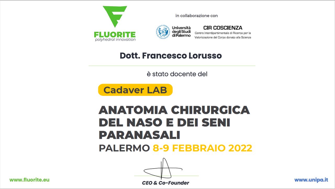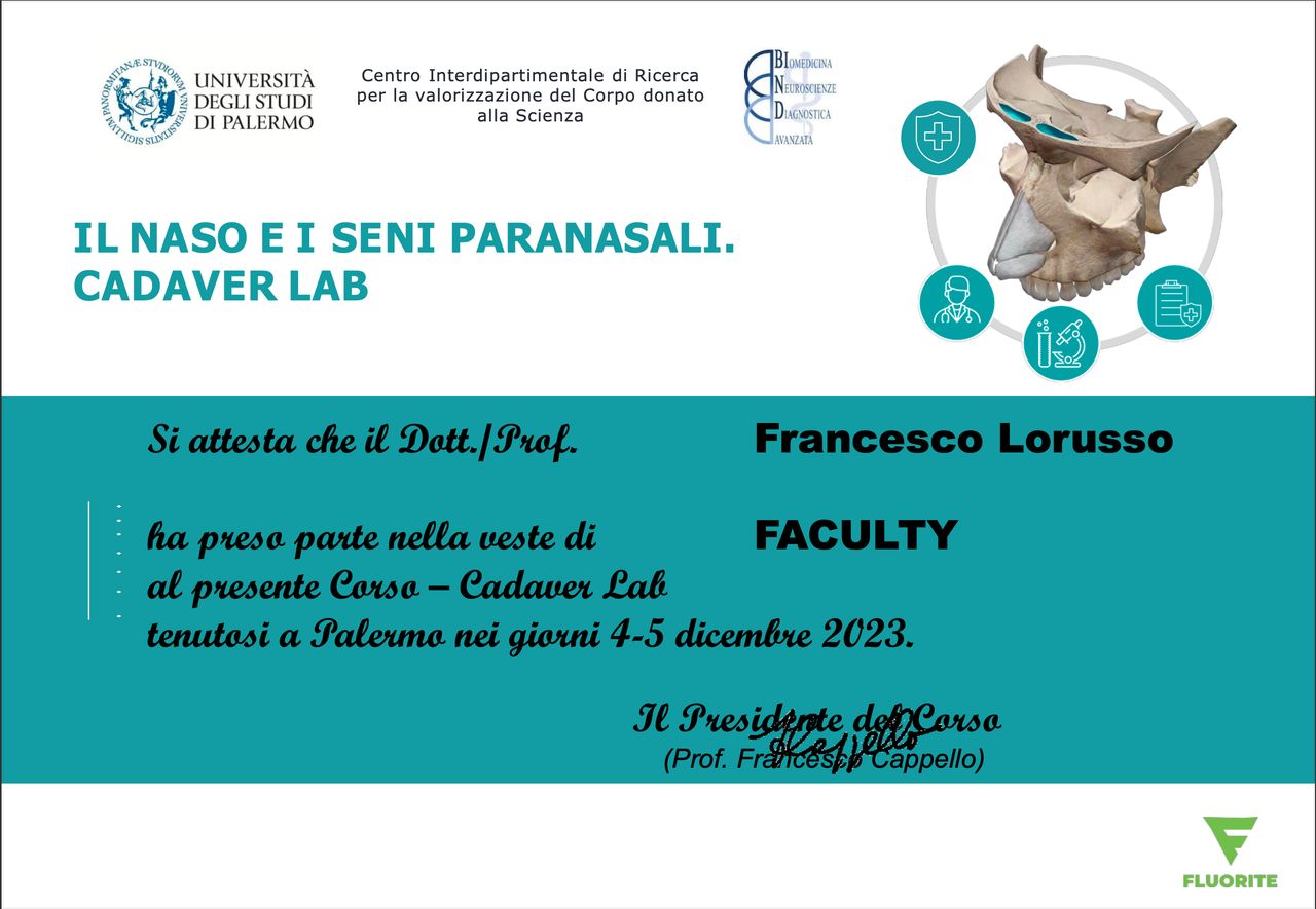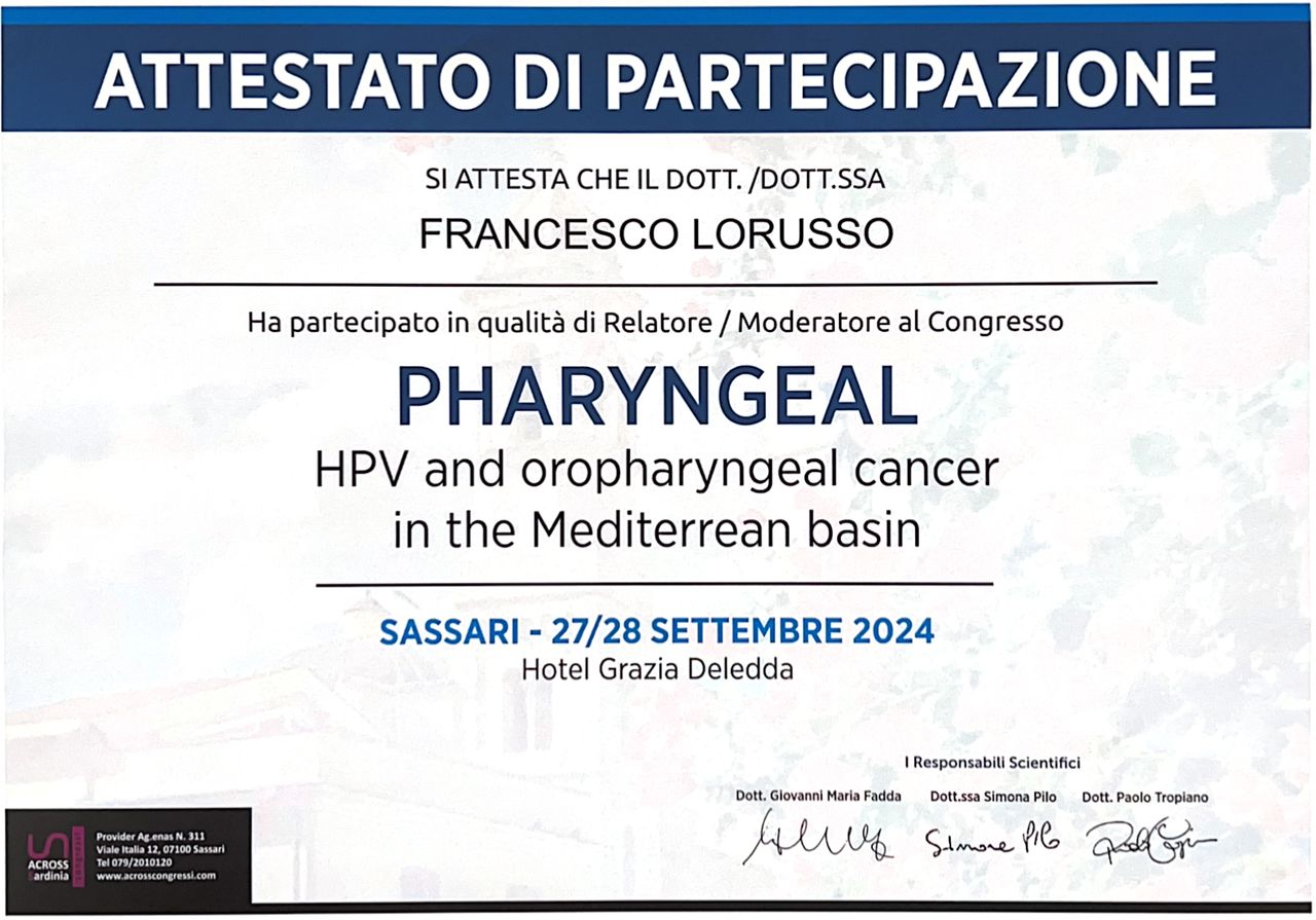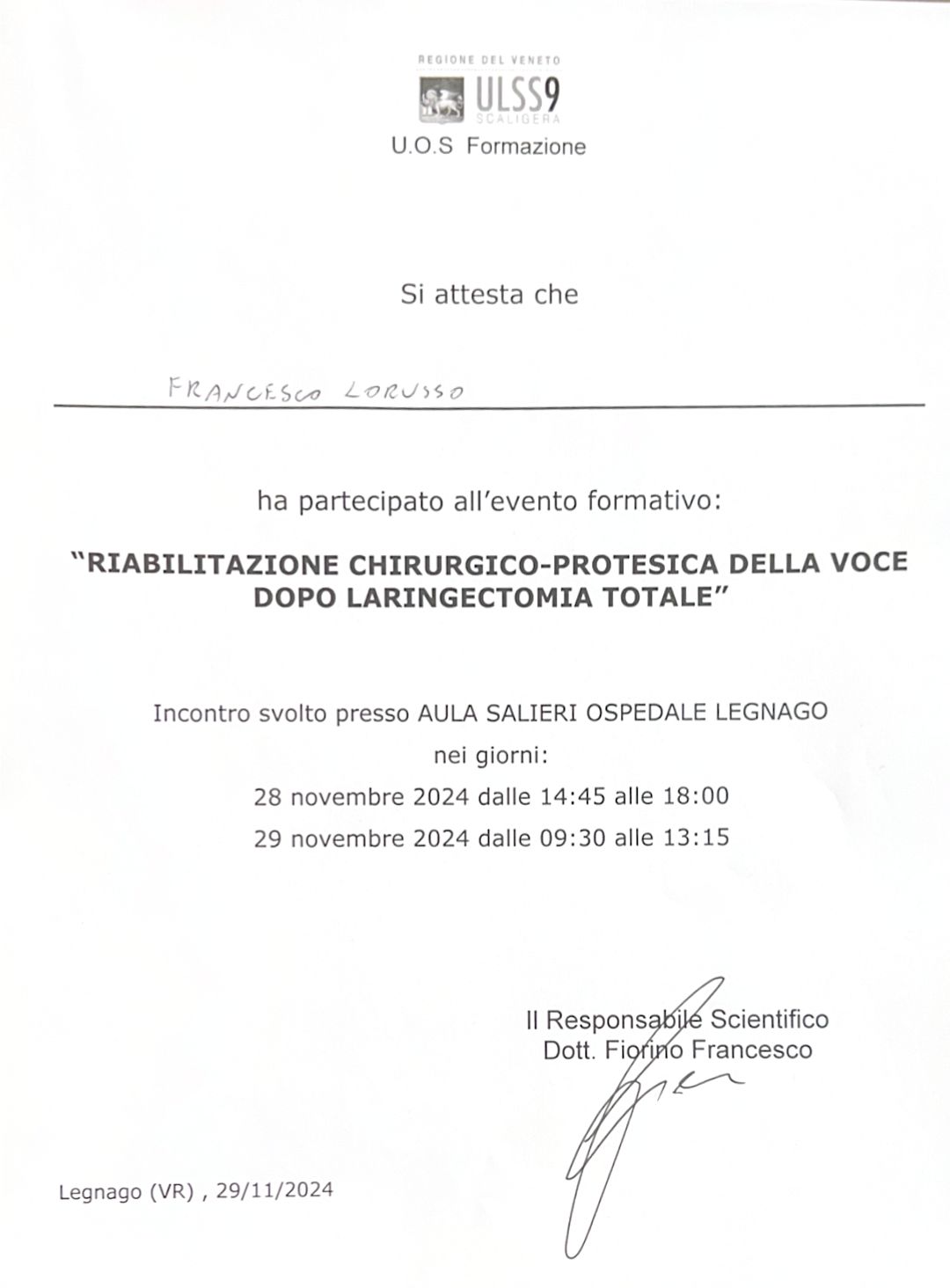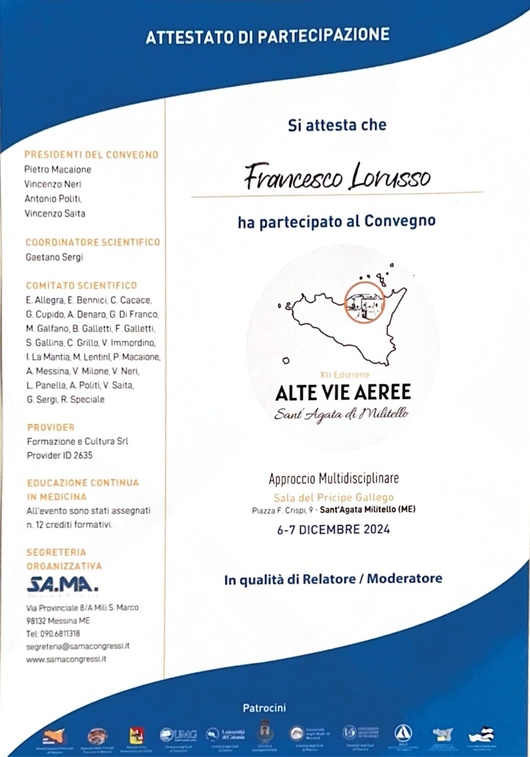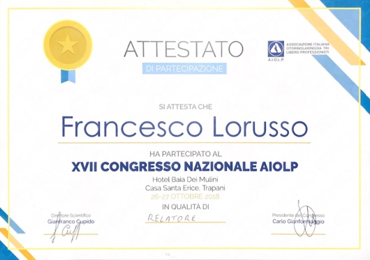 Nel 2009 Laurea Magistrale in Medicina e Chirurgia – Università degli Studi di Palermo (voto: 110/110 lode e menzione per la tesi dal titolo: VALUTAZIONE DEL PATTERN DINAMICO DELLE VIE AEREE SUPERIORI NEI GRANDI OBESI, ATTRAVERSO MANOVRA DI MÜLLER. Nel 2015 il conseguimento del diploma di Specializzazione in Otorinolaringoiatria presso l’Università degli Studi di Palermo, con la votazione di Lodevole, discutendo la tesi dal titolo: ALGORITMO DIAGNOSTICO E TERAPEUTICO NEI PAZIENTI AFFETTI DA OSAS: REVISIONE DELLA LETTERATURA E NOSTRA ESPERIENZA. Dal 17 Maggio 2010 al 17 Maggio 2015 Medico in formazione specialistica presso la scuola di Specializzazione in Otorinolaringoiatria di Palermo. Ha eseguito oltre 800 interventi chirurgici di cui oltre 330 da primo operatore.