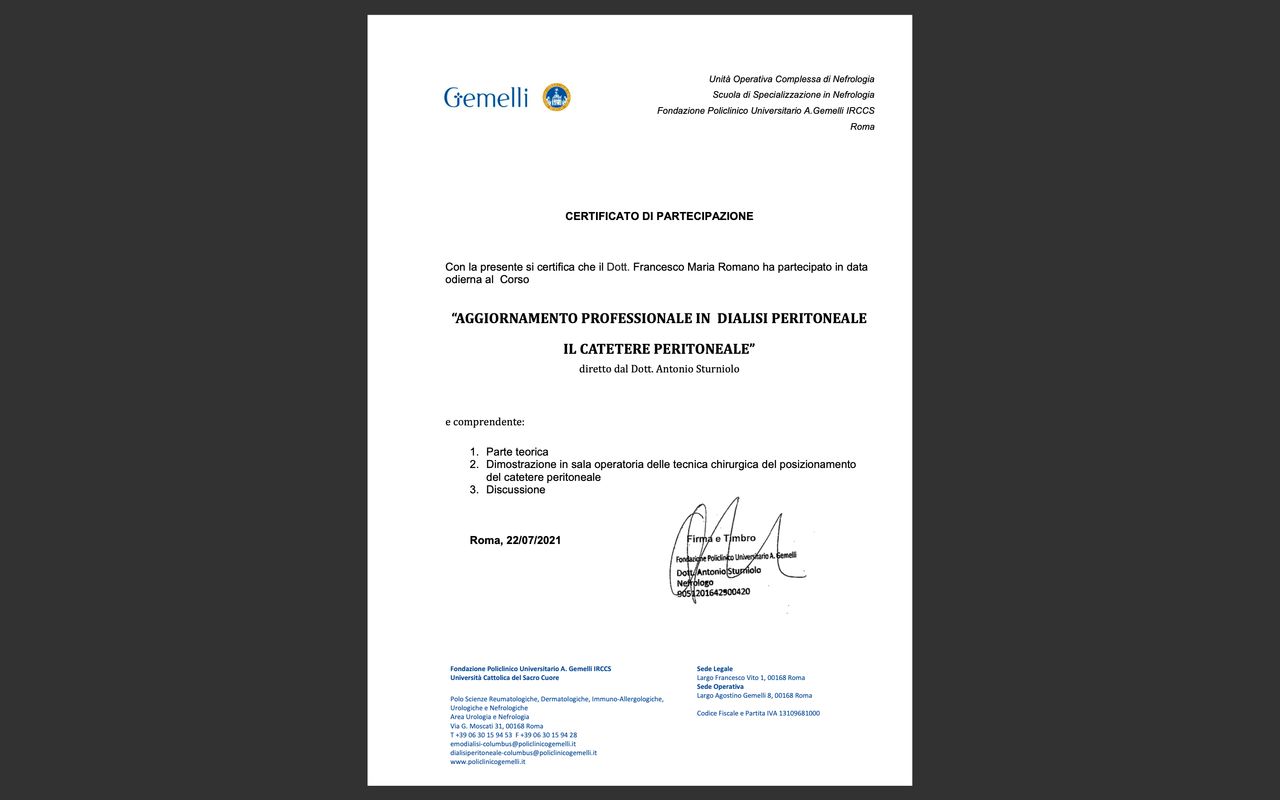 Referente Chirurgo del Centro di Dialisi Peritoneale diretto dal Prof. Luca De Nicola, dal 2021 mi occupo del posizionamento dei Devices per dialisi, con una casistica di oltre 40 impianti di catetere peritoneale.