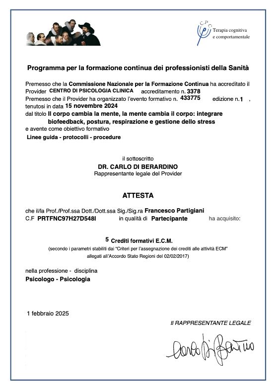 Professionista attento, empatico e molto competente. Mi sono sentito ascoltato e supportato. Il percorso personalizzato che sto percorrendo è davvero utile e lo consiglio senza esitazioni.