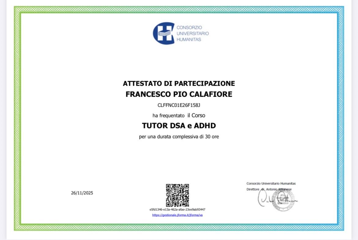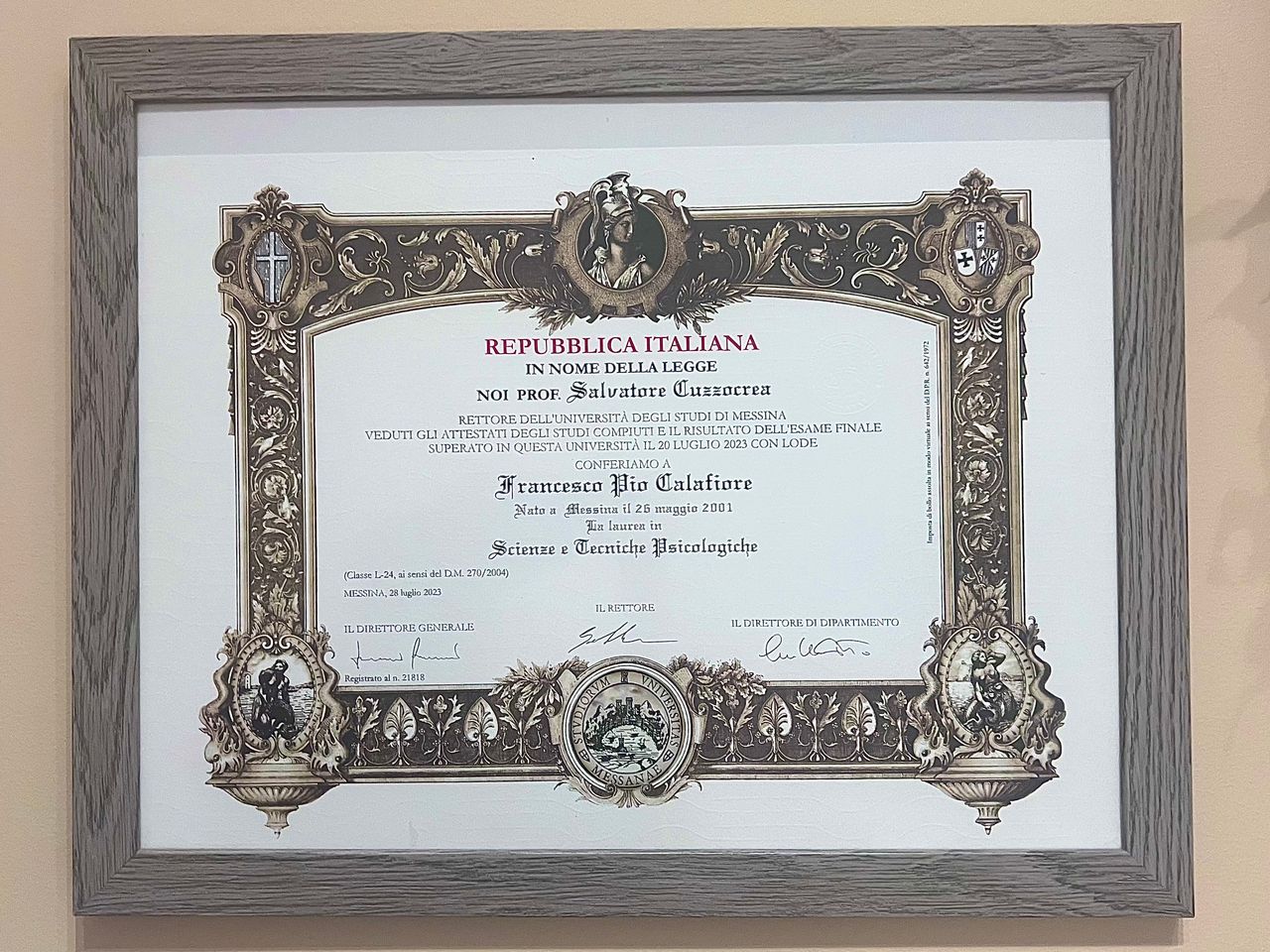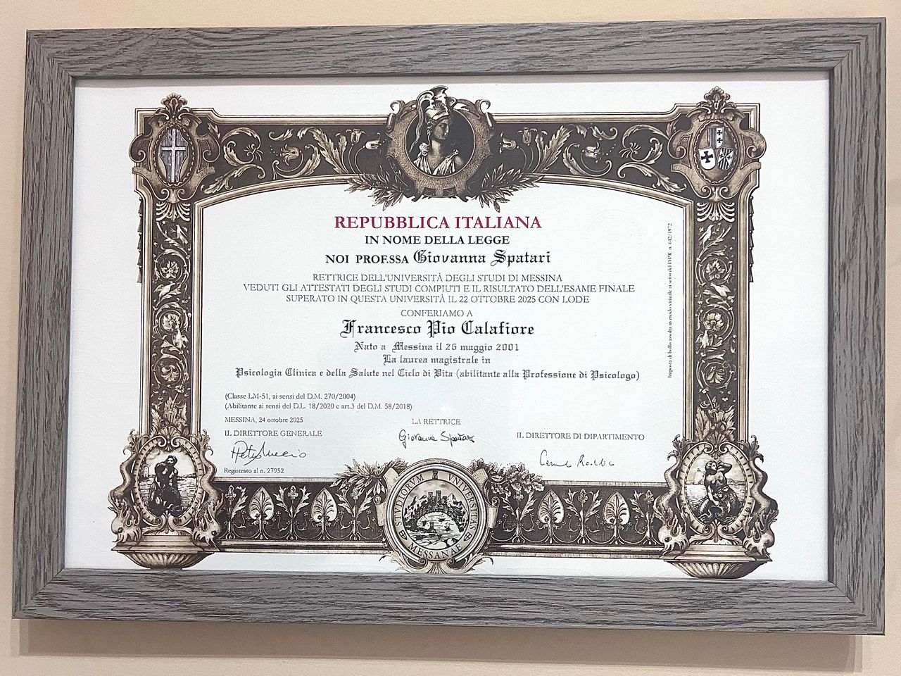 Sono il dott. Francesco Pio Calafiore, Psicologo Clinico e della Salute, regolarmente iscritto all'Albo dell'Ordine degli Psicologi della Regione Siciliana al n. 13331-A.