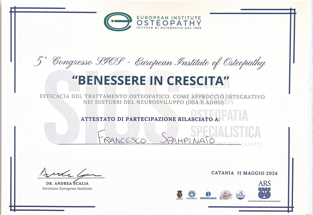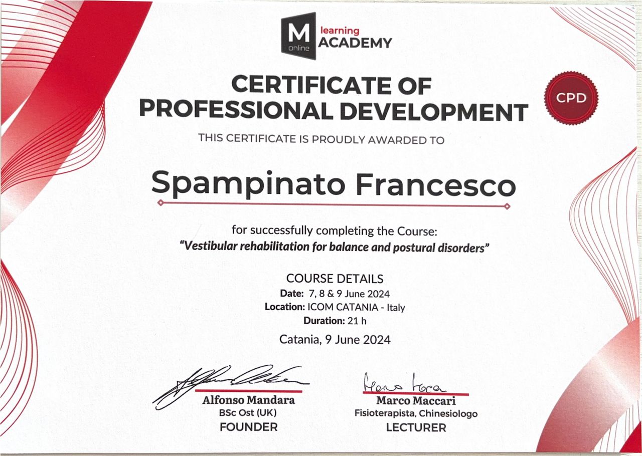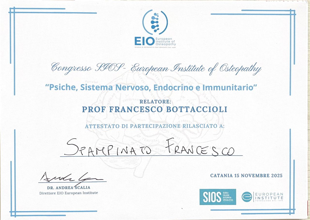 Durante questo periodo ho svolto un tirocinio clinico presso il CCFO ICOM-Catania con oltre 1500 ore di esperienza, affiancato da tutor esperti e medici. Successivamente ho conseguito un certificato post-graduate in osteopatia dello sport e delle arti performative.