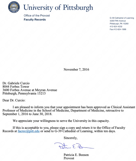 L'Università di Pittsburgh gli ha conferito nel 2016 il titolo di Clinical Assistant Professor of Medicine.