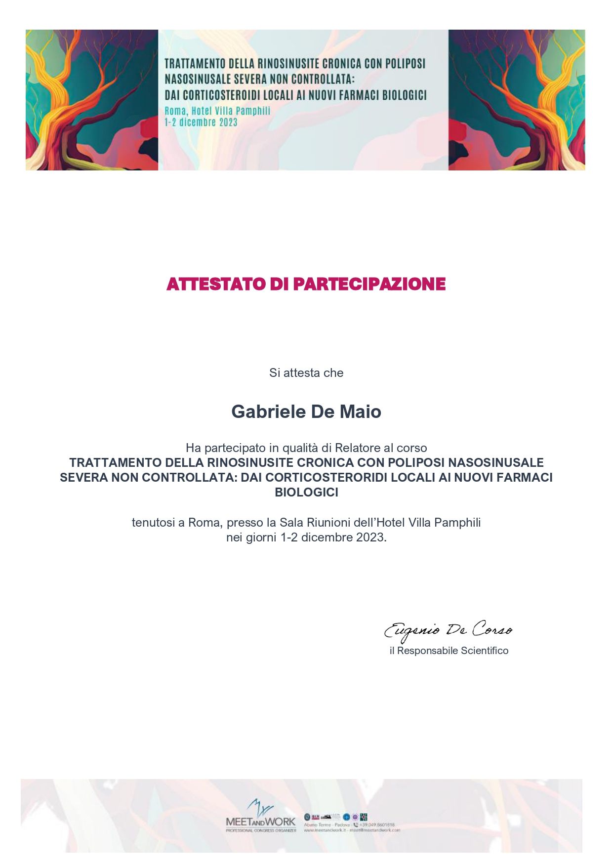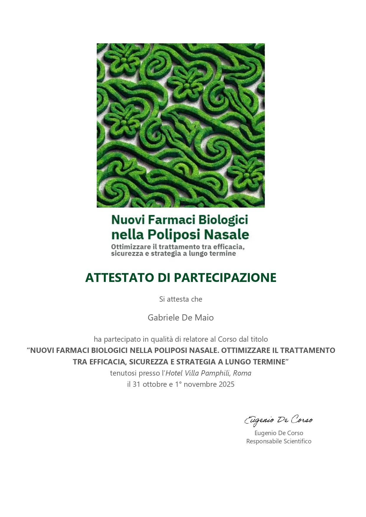 Mi chiamo Gabriele de Maio, specialista in Otorinolaringoiatria e Chirurgia Cervico-Facciale. Mi sono formato presso il Policlinico Universitario A. Gemelli e svolgo la mia attività clinica presso l’Ospedale Isola Tiberina “Gemelli Isola” a Roma.
