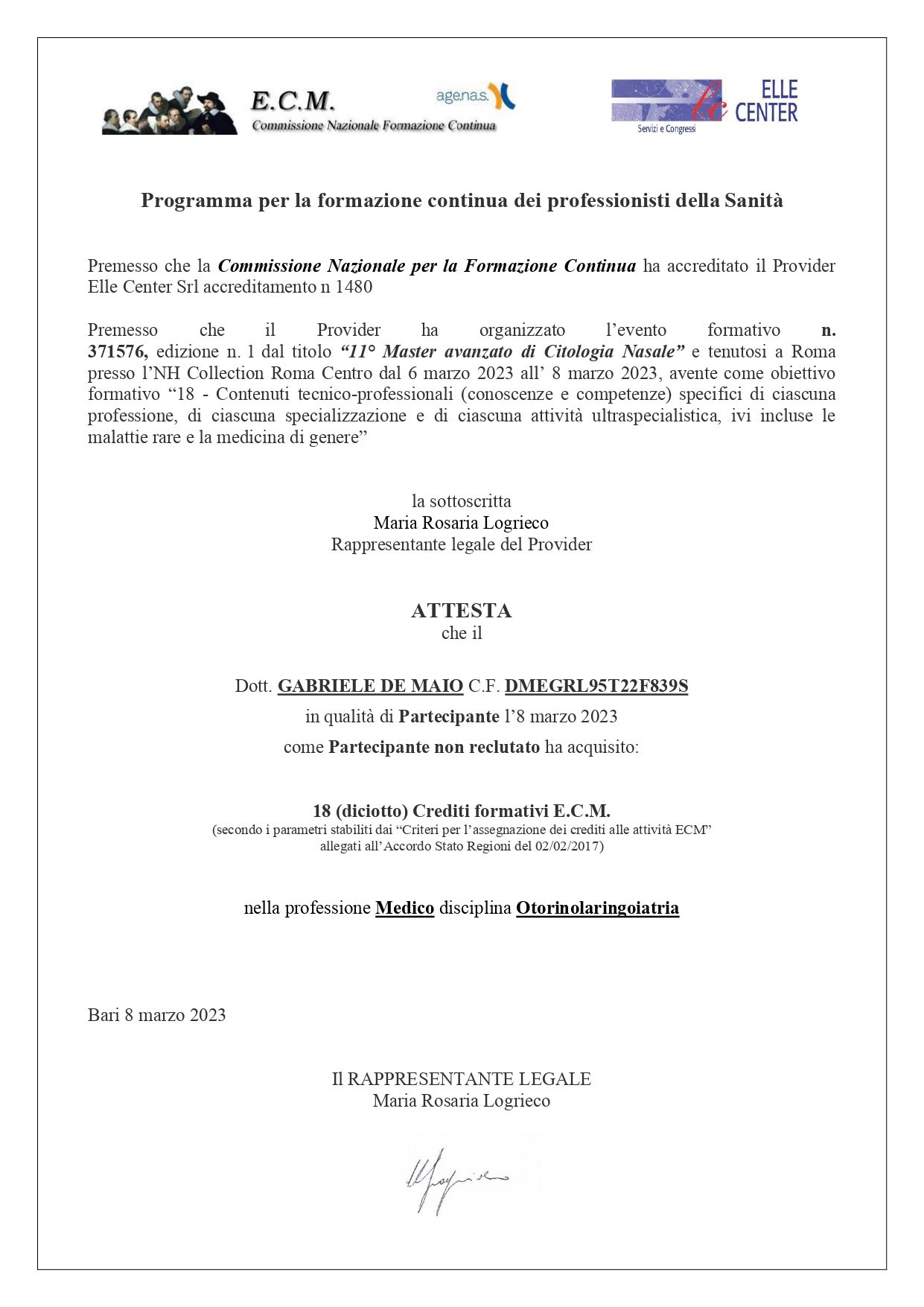 Ho conosciuto il Dott. de Maio per un problema di polipo alle corde vocali e sin dalla prima visita mi sono sentito ascoltato e rassicurato. Mi ha spiegato con grande chiarezza la diagnosi e le varie opzioni di trattamento, rispondendo con pazienza a tutte le mie domande.