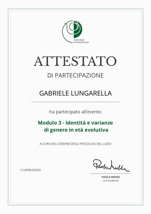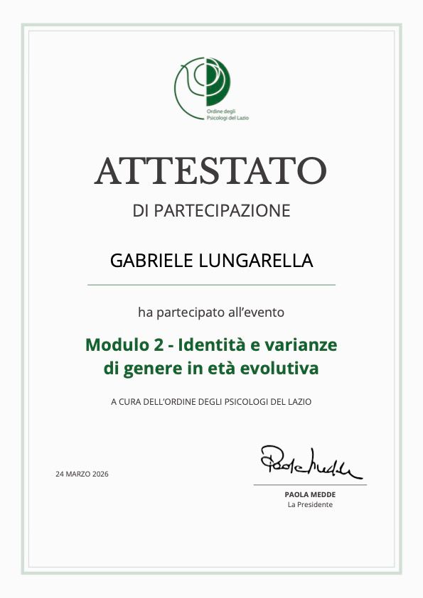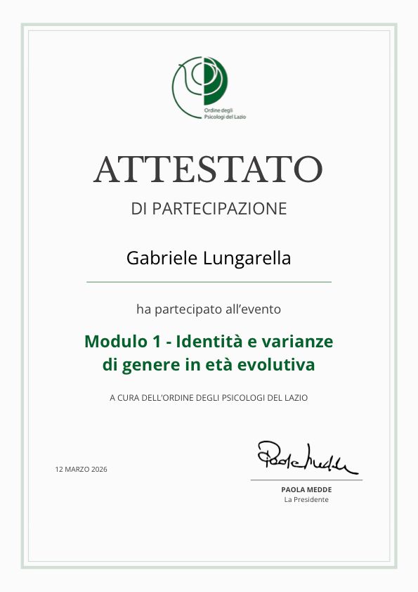 Sono Gabriele Lungarella, psicologo psicoterapeuta iscritto all'Albo degli Psicologi del Lazio, approccio Pluralistico Integrato. Lavoro in ambito clinico privato con singoli e coppie in età adulta. Svolgo attività di docenza e formazione in gruppo integrando aree e settori differenti. Mi alterno con passione tra le attività di psicoterapia, formazione, consulenza e fotografia nella convinzione che la comprensione della natura umana richieda flessibilità, adattabilità e conoscenza olistica.