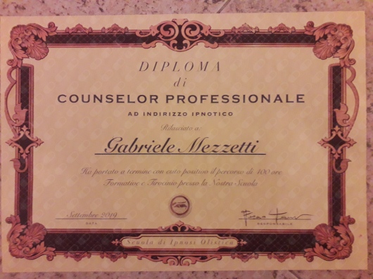 - Diploma di Counselor Professionale ad Indirizzo Ipnotico presso “Scuola di ipnosi olistica” di Milano (scuola biennale);