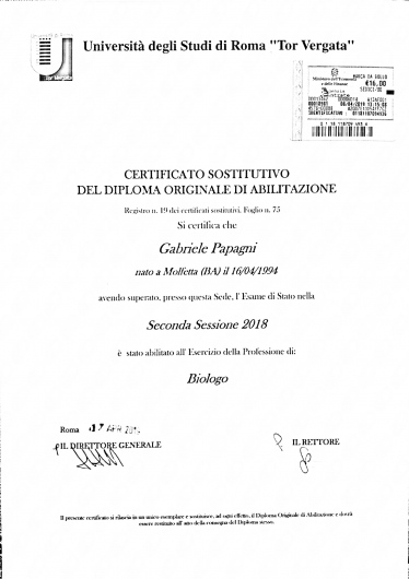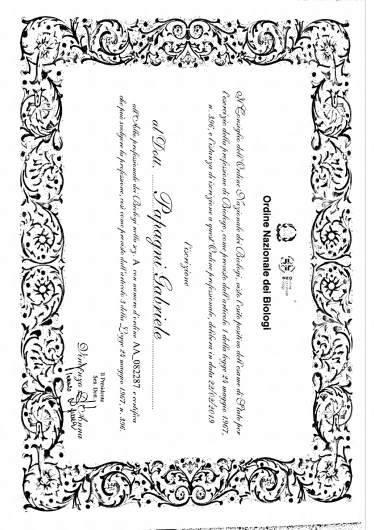 Abilitato tramite l’Esame di Stato alla professione di Biologo e iscritto all’albo professionale dell’Ordine Nazionale dei Biologi (ONB).