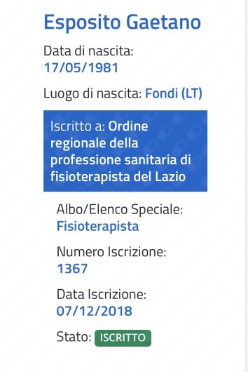 Ottimo fisioterapista, molto capace nel proprio lavoro, ti segue e ti consiglia cosa fare di volta in volta. È disponibile in qualsiasi momento. Splendido lo studio di Roma, super pulito, se dovessi avere bisogno di fare altre fisioterapia sicuramente ritornerei dal dottore Esposito Gaetano