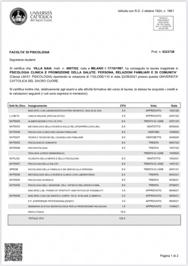 Ho avuto un’ottima esperienza con la giovane dottoressa Gaia Villa. Lo studio è accogliente e ben organizzato, con tempi di attesa minimi e un sistema di comunicazione chiaro ed efficiente. La dottoressa è stata estremamente professionale, empatica e attenta alle mie esigenze. Mi ha fatto sentire a mio agio fin da subito, ascoltandomi con attenzione e fornendo spiegazioni chiare sui vari passi del percorso terapeutico. Consiglio vivamente a chiunque cerchi un supporto psicologico di rivolgersi a lei.