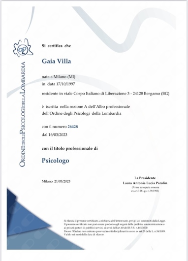 Il percorso terapeutico con Gaia è stato per me molto prezioso. Grazie alla sua competenza, sensibilità ed empatia, ho potuto lavorare su aspetti importanti di me e affrontare momenti complessi con maggiore consapevolezza. È un'ottima professionista, trasmette fiducia e l'ho sempre sentita molto autentica: la consiglio!