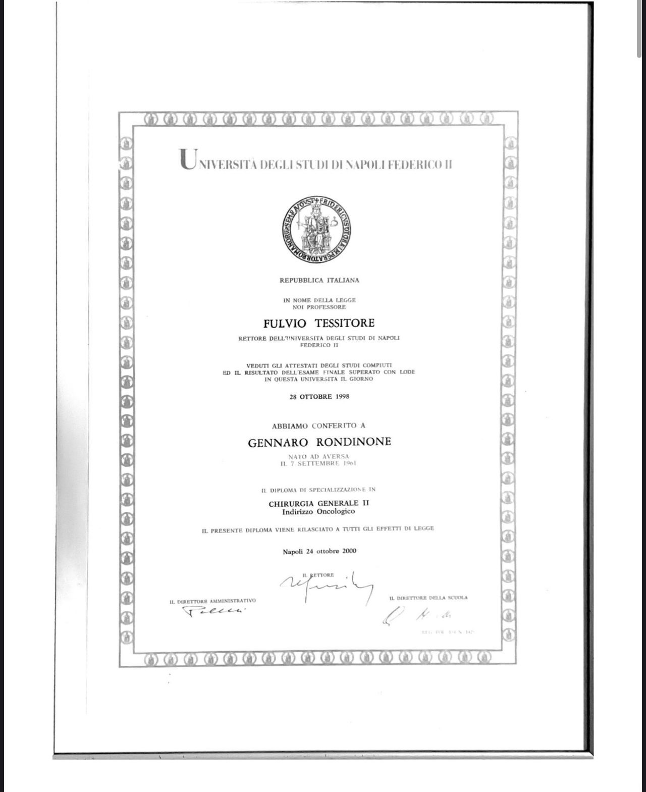 Il dottor Gennaro Rondinone ha effettuato su mio marito un intervento abbastanza delicato con risultati eccezionali. Al di là, però, delle indiscutibili doti strettamente professionali, ne vanno evidenziate altre di fondamentale importanza per un medico: l’empatia, l’umanità e la simpatia, che permettono al paziente di sentirsi a proprio agio e di affrontare con serenità determinate situazioni. Insomma, il giuramento di Ippocrate preso alla lettera! Una particolare menzione va a sua figlia, la d.ssa Angela, che ha ereditato dal papà ogni singola dote citata.