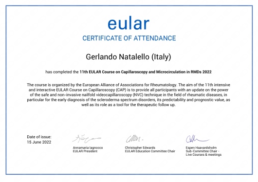 Il percorso di formazione specialistica, svolto presso l’Unità di Reumatologia della Fondazione Policlinico Gemelli e Presidio Columbus, mi ha permesso di maturare esperienza nella diagnosi e nel trattamento delle principali patologie immuno-reumatologiche e internistiche, gestendo in autonomia pazienti in regime di degenza, Day Hospital e ambulatoriale. Ho sviluppato inoltre competenza nell’esecuzione e refertazione della capillaroscopia periungueale a scopo di diagnosi e follow-up. Contestualmente, ho seguito con profitto numerosi corsi di approfondimento e aggiornamento organizzati dalle società di Reumatologia Italiana (SIR) ed Europea (EULAR), di cui sono membro dal 2016.