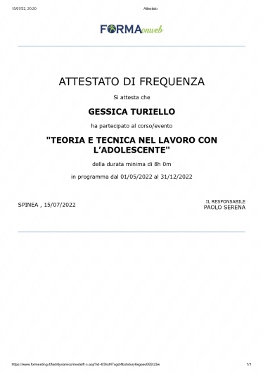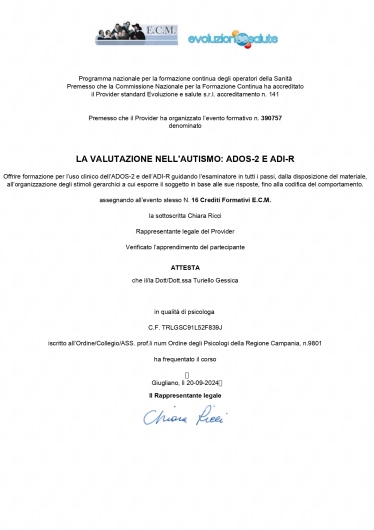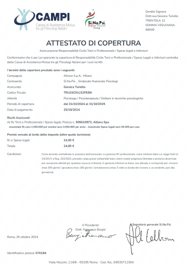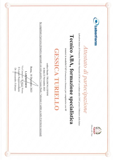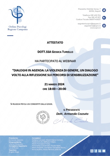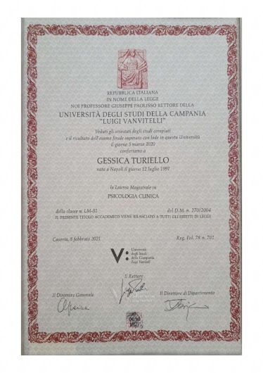 Sono la Dott.ssa Gessica Turiello, Psicoterapeuta in formazione presso l' Istituto Superiore di Psicologia e di Psicoterapia Relazionale e Familiare (ISPPREF) e socio ISPPREF. Opero attraverso interventi di supporto psicologico e psicoterapico, affinchè tu possa riscoprire e rinforzare le tue risorse inutilizzate o apprenda un modo più funzionale di utilizzarle. Lavoro per il benessere della singola persona. Ogni persona è diversa dall'altra e merita una cura speciale. Per cui considero la terapia un abito cucito su misura che possiamo modificare strada facendo, in base ai tuoi bisogni. Mi occupo in particolar modo di: -interventi individuali, volti alla comprensione e risoluzione di problematiche personali che possono costituire fonte di disagio e di difficoltà in ogni sfera della vita quotidiana. -interventi familiari, volti alla comprensione e all'utilizzo di tecniche di gestione di dinamiche familiari disfunzionali. - terapia di coppia: effettuerò degli incontri di valutazione con la restituzione di una diagnosi relazionale sul vostro funzionamento di coppia. La mia area di specialità è la relazione. Lavoreremo sulle sue aree di criticità sulla base della stesura di un progetto terapeutico che realizzeremo insieme. -interventi volti alla crescita personale, all'orientamento scolastico e lavorativo - interventi clinici e psico-diagnostici, attraverso la somministrazione di test psicologici - lavoro con adolescenti e trattazione delle problematiche legate a questa fase di sviluppo - accompagnamento in gravidanza, volto al sostegno in una fase delicatissima della vita di una donna e alla prevenzione del rischio per lo sviluppo di disturbi , quali la depressione post-partum - supporto alla genitorialità e gestione dei conflitti genitori/figli grazie a tanta esperienza appresa durante la mia formazione all'interno dell'ASL e della mia esperienza clinica