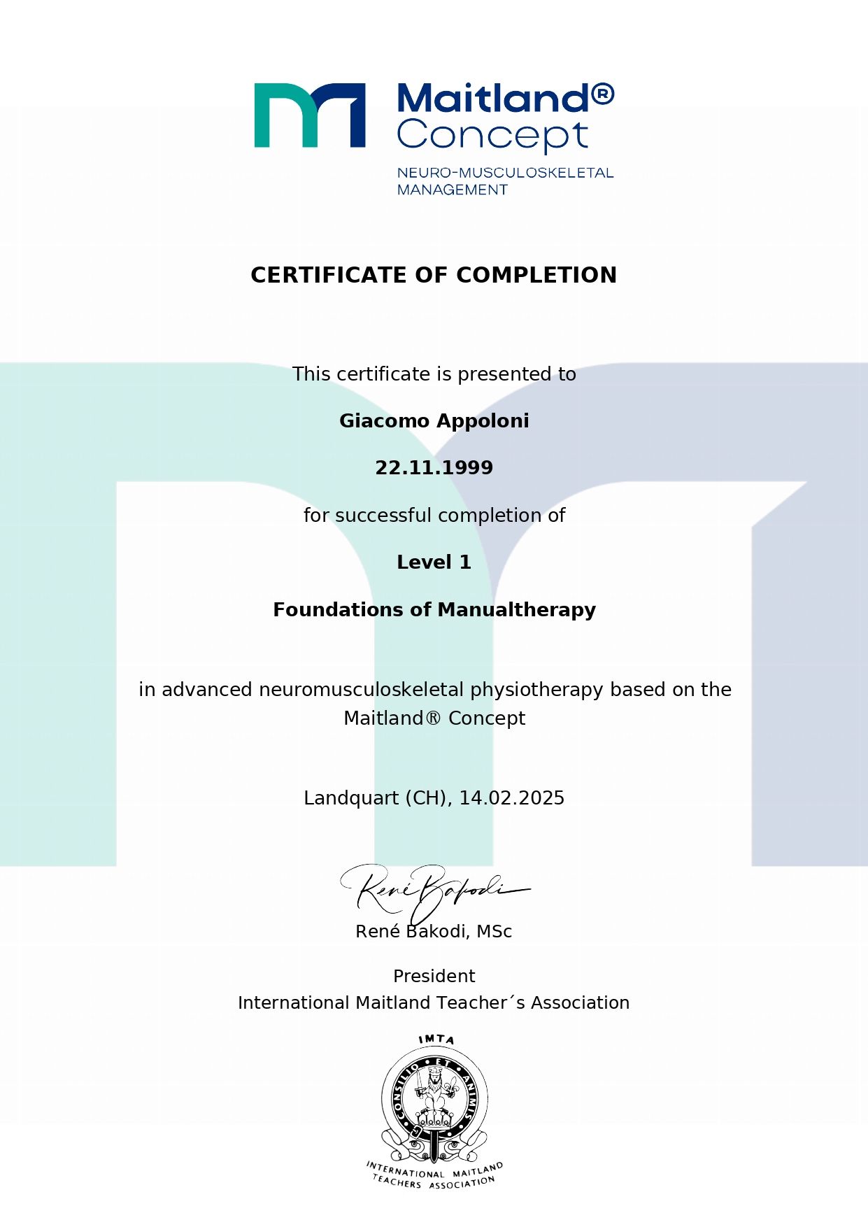 Sono il dott. Giacomo Appoloni, fisioterapista laureato presso l’università di Chieti nel 2022 con votazione 110/110L. Specializzato in Terapia Manuale con il conseguimento del corso Maitland e attualmente studente del Master OMPT presso l’università di Tor Vergata per la specializzazione nei disturbi muscoloscheletrici e reumatologici. Riabilitazione Posturale Globale (metodo Souchard), conseguito nel 2023. Mi occupo di riabilitazione muscoloscheletrica e di tutte le problematiche associate ad esse (cervicalgie, lombalgie, problemi aspecifici e specifici di spalla, artrosi e protesi di anca e ginocchio, distorsioni di caviglia, ricostruzioni legamentose e meniscali). Vi aspetto in studio per capire insieme come affrontare insieme a 360 gradi la vostra problematica