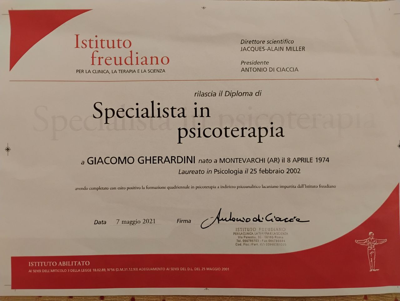 Sono membro partecipante della Scuola lacaniana di psicoanalisi e uno dei responsabili della Segreteria di Pisa della Scuola lacaniana di psicoanalisi.