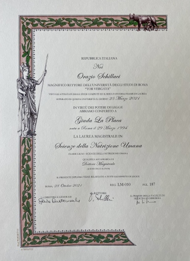 Ho conseguito una Laurea in Biotecnologie presso l'Università degli Studi della Tuscia con un lavoro di tesi volto all'analisi del ruolo della nutrizione sul genoma umano. Successivamente ho conseguito una Specializzazione in Scienze della Nutrizione Umana presso l'Università degli Studi di Roma "Tor Vergata" con uno studio sperimentale dal titolo "La voce come metodo diagnostico: uno studio su pazienti affetti da obesità patologica" condotto insieme al dipartimento di Ingegneria Informatica dell'Università Tor Vergata.