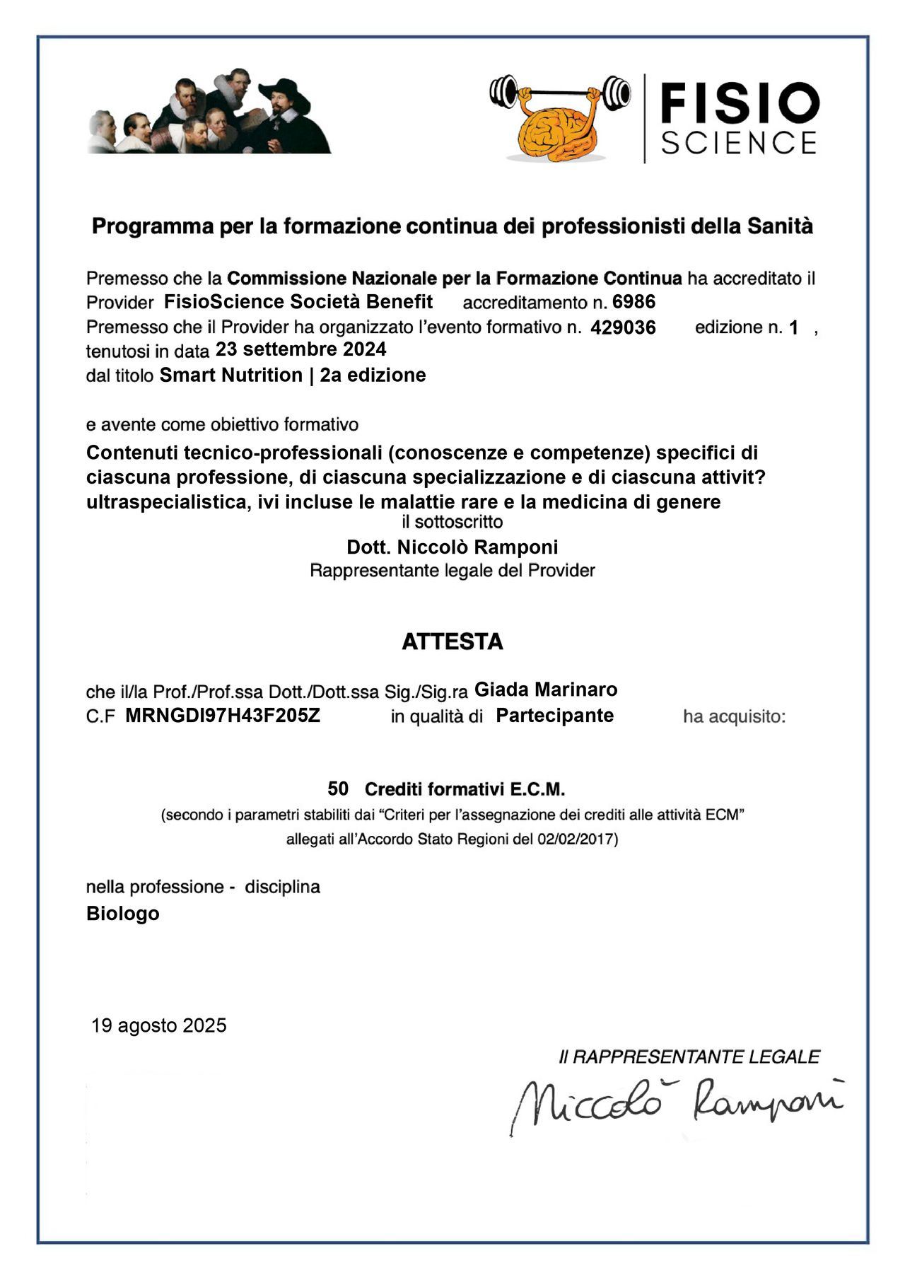 Una professionista di grande valore che consiglio con sincera gratitudine.• Dott.ssa Giada Marinaro Biologa Nutrizionista • educazione alimentare •